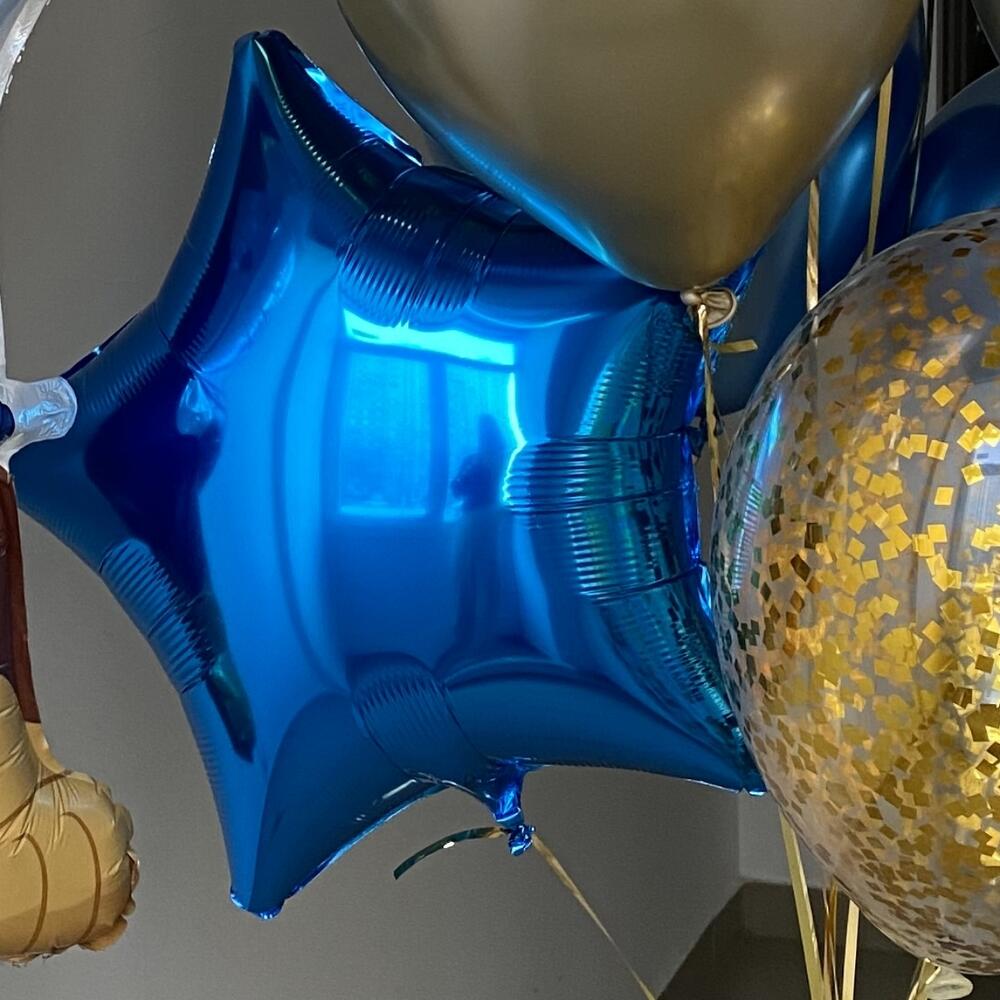 Набор состоит из: Фонтан: - 3 синих шара хром 35см - 3 золотых шара хром 35см - 2 шара с золотым конфетти 35см - 1 фольгированная синяя звезда 46см - 1 фольгированная золотая звезда 46см - грузик Фольгированная фигура Чейз 94см *заказ будет доставлен в плотном прозрачном транспортировачном пакете