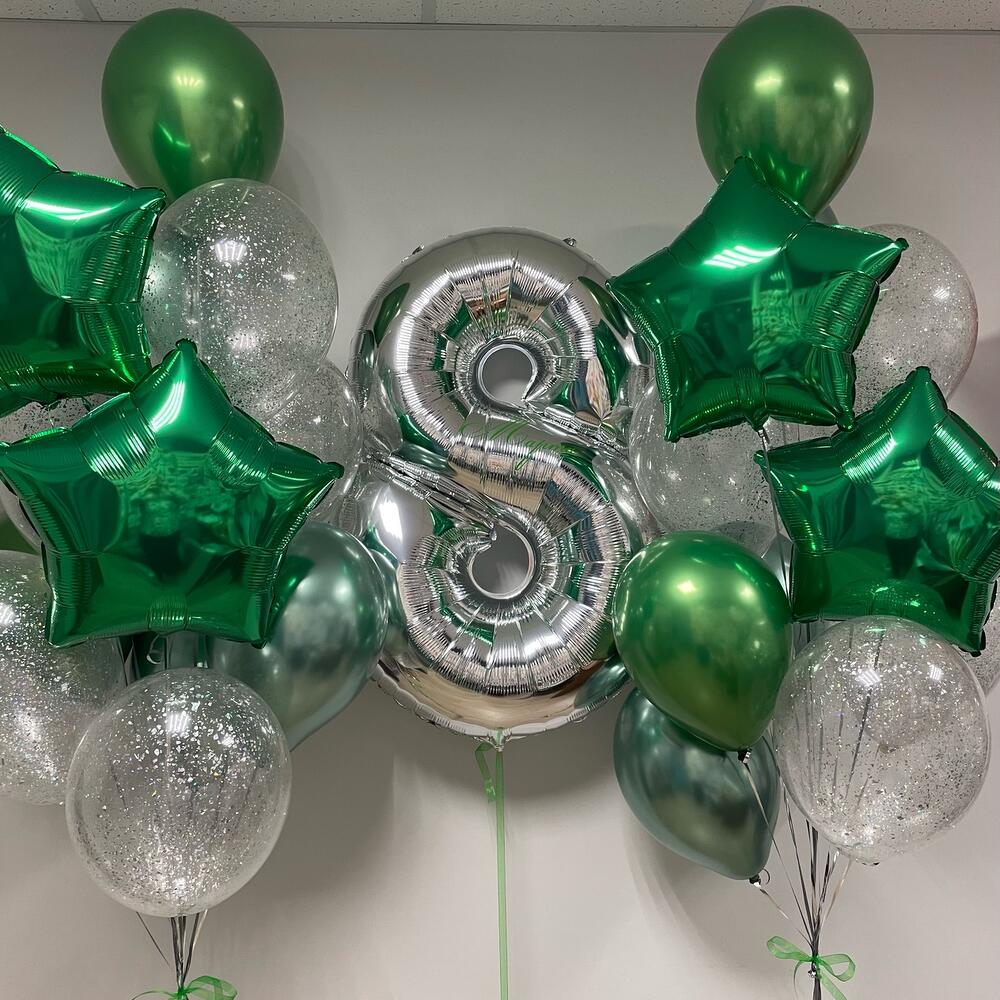 Набор включает Цифру 8 с надписью Марта 102 см с гелием на грузе, 2 фонтана по 12 единиц каждый, состоит из 2 звезды фольга, 3 латекс изумруд хром, 2 латекс хром зеленый, 5 латекс конфетти серебро Весь латекс обработан специальным раствором для долготы полета. Упаковка в транспортировочный пакет