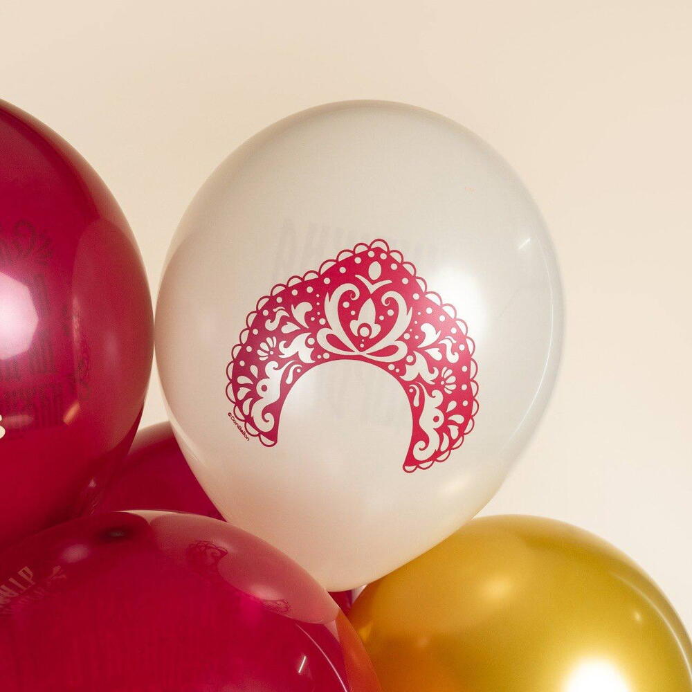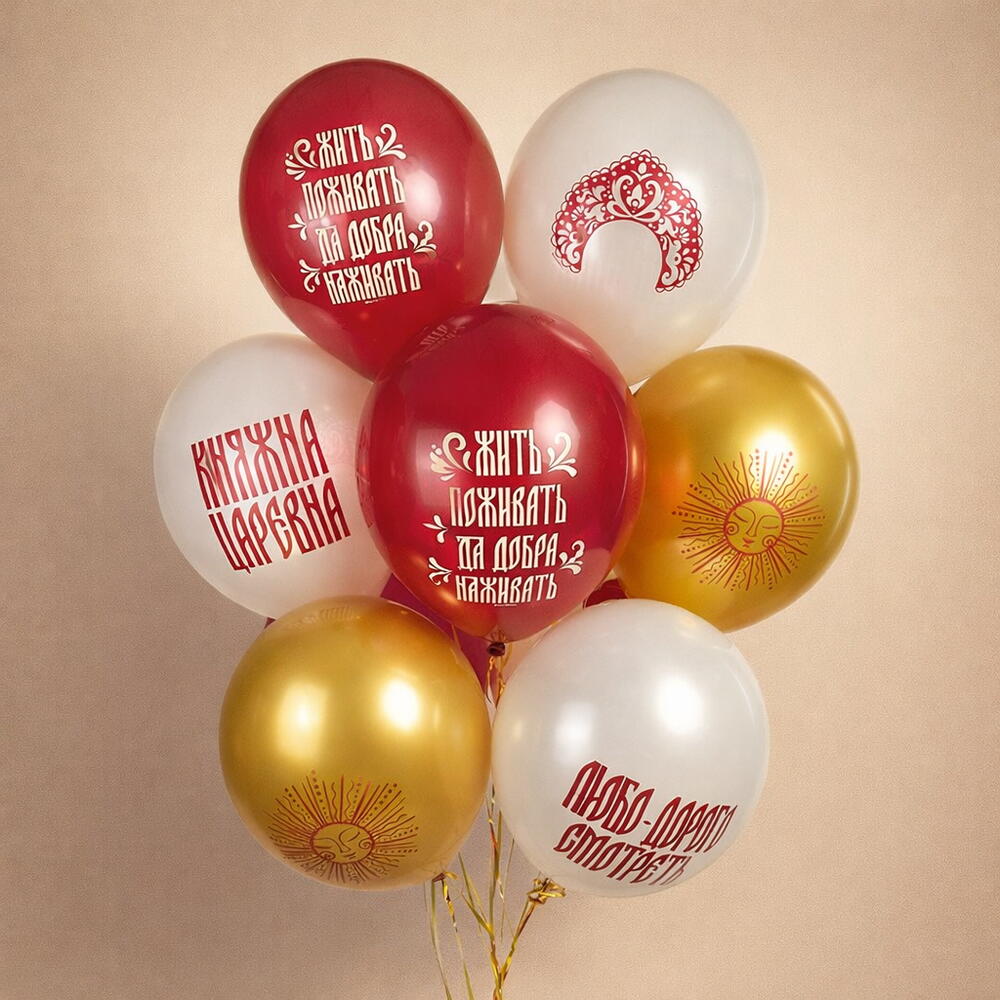 10 шт латексных шаров Княжна Царевна Композиция из 10 латексных гелиевых шаров в русском стиле — эффектное и атмосферное решение для тех, кто ценит эстетику, традиции и визуальную выразительность. Шары выполнены в стилистике русских сказок и народного орнамента, с надписями и образами, которые сразу создают узнаваемое настроение: «Жить-поживать да добра наживать», «Княжна царевна», «Любо-дорого смотреть», символы солнца, кокошник и декоративные элементы, отсылающие к фольклору и русской культуре. ___ Цвет 5709201