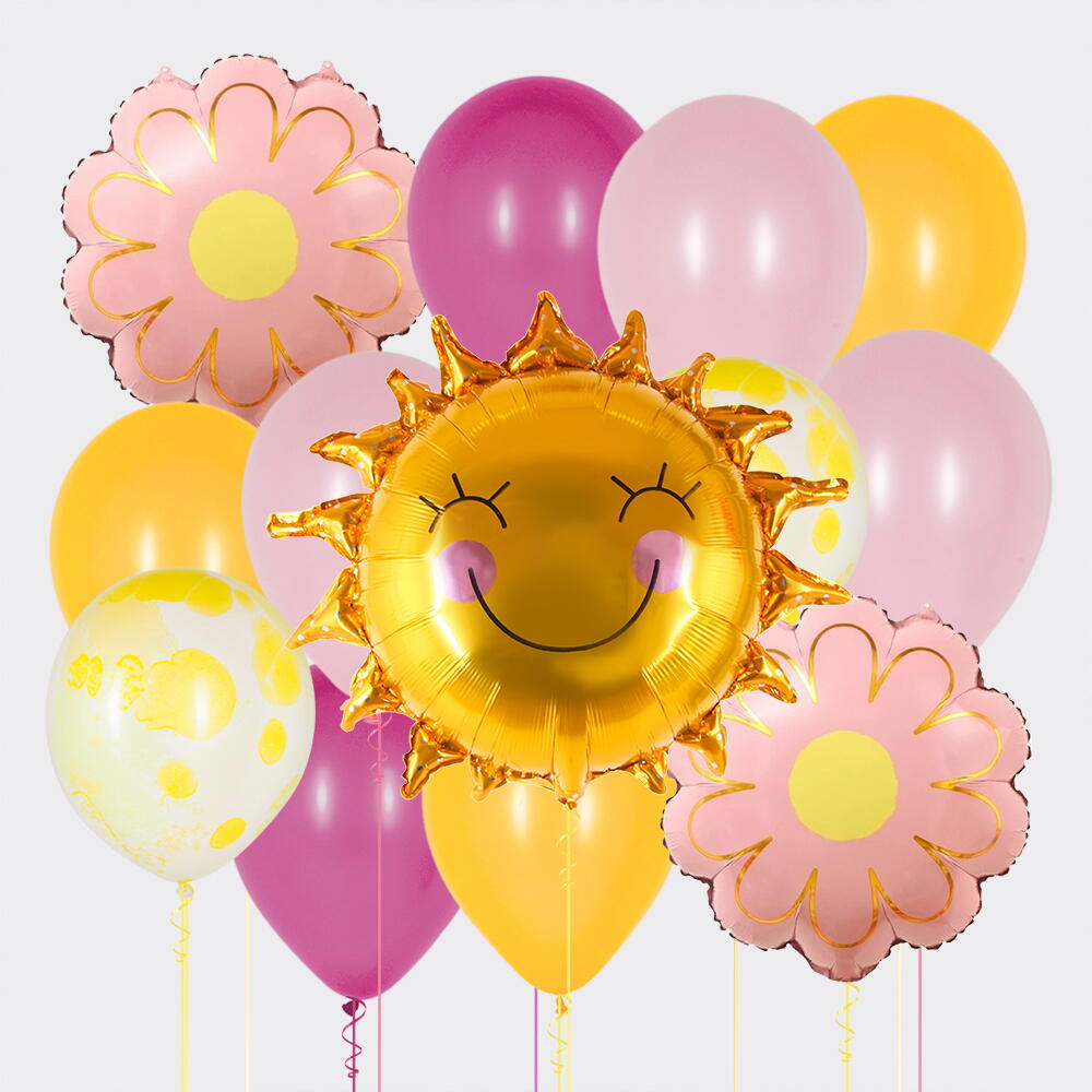 Шары в наборе связаны лентой другого цвета, и упакованы в прозрачный пакет. Вы можете распустить их под потолок или привязать композицию к предметам интерьера. В состав входят: 1 фольгированная фигура Солнышко 66 см 2 фольгированные фигуры Ромашка розовая 53 см 2 латексных шара фуксия пастель 30 см 3 латексных шара розовый пастель 30 см 2 латексных многоцветных шара желтого цвета 30 см 3 латексных шара золотистый пастель 30 см Дополнительно Вы можете приобрести грузик.