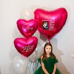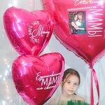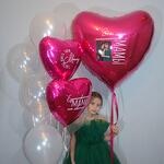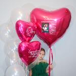 Гигантское сердце (91 см) с фотографией и индивидуальным текстом 4 белых шарика (35 см) 3 прозрачных шарика (35 см) 2 сердечка (45см) с индивидуальной надписью
