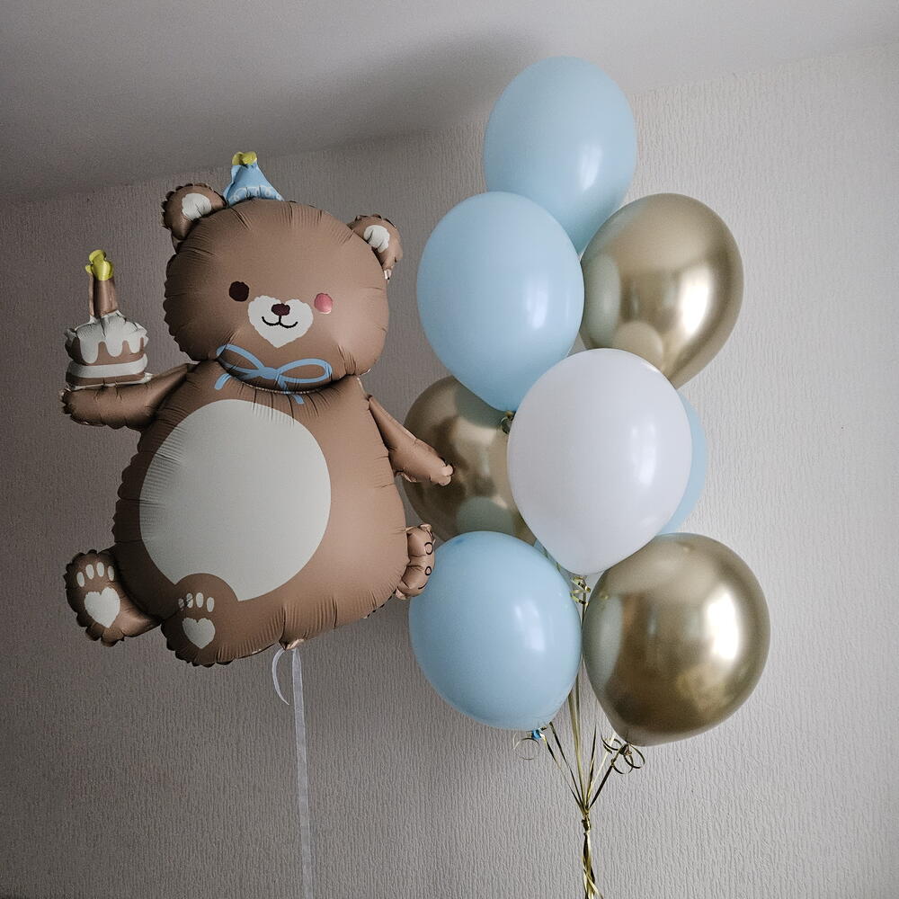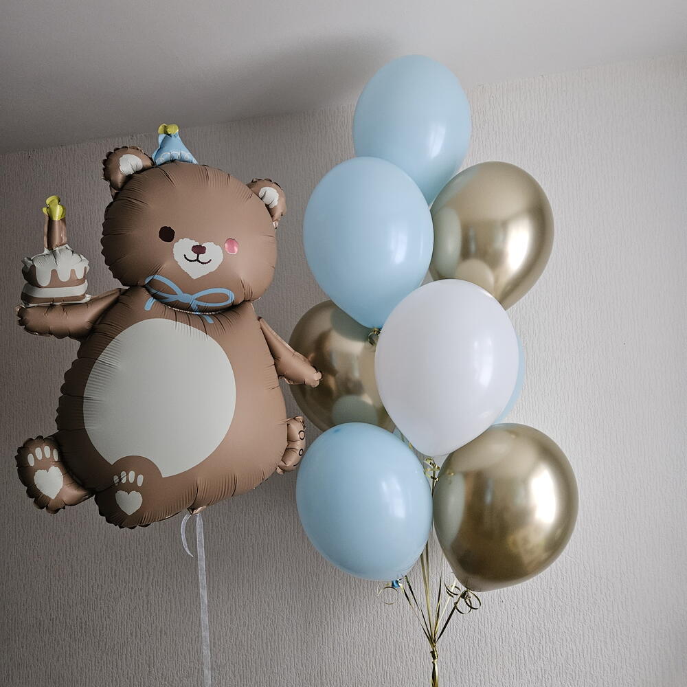 Набор шаров голубые, белые и золотые и мишка, медведь-11шаров