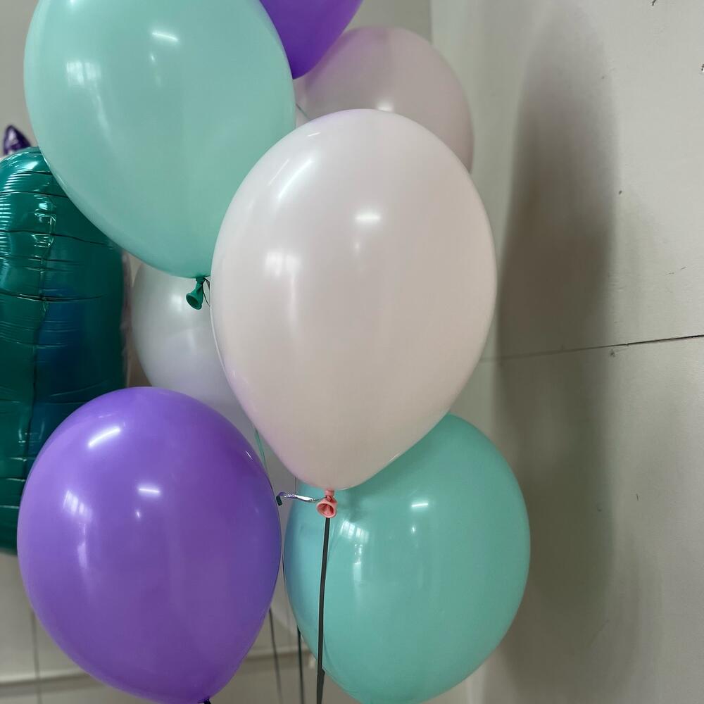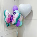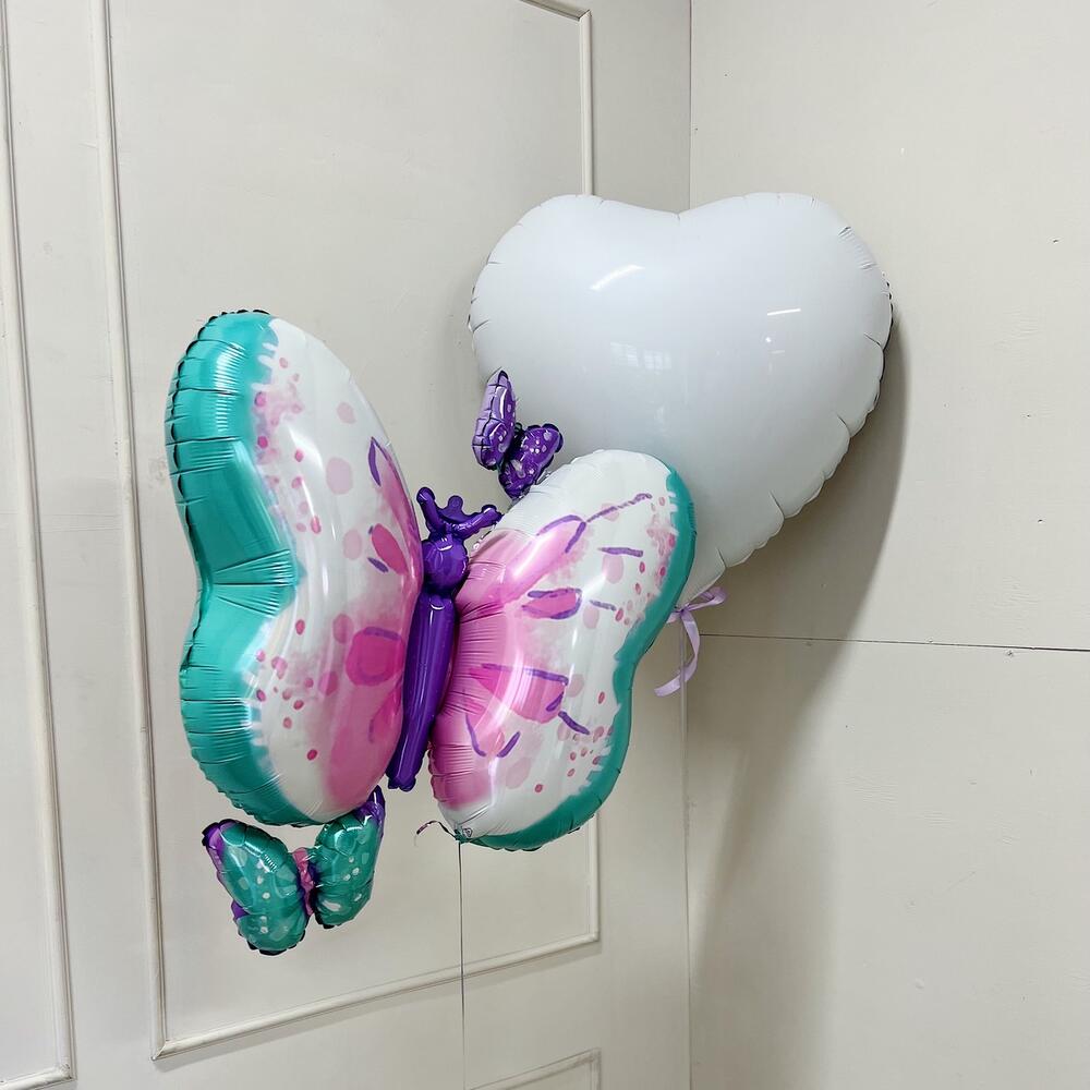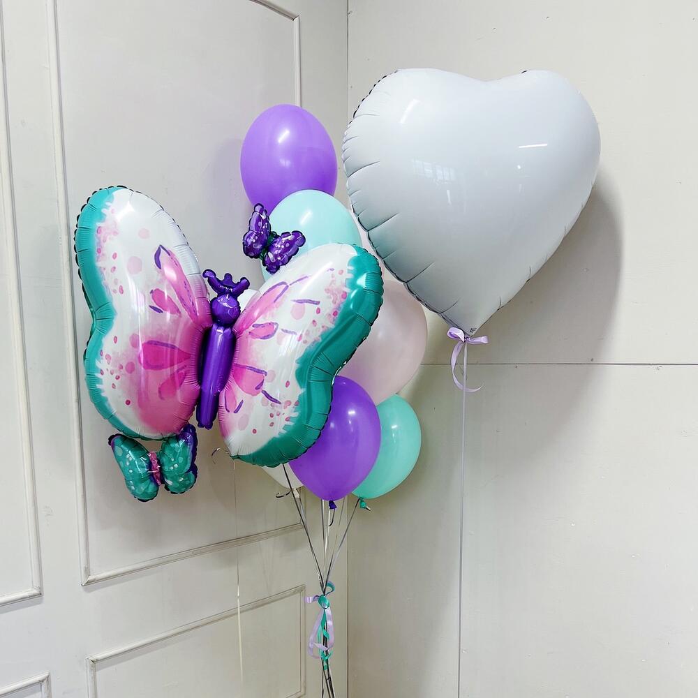 Фонтан из Шаров 8 штук (2 фиолетовых, 2 белых, 2 тифанни, 2 розовых Макарунс) Шар Бабочка , сердце 81 см Нежная Бабочка с белым сердцем