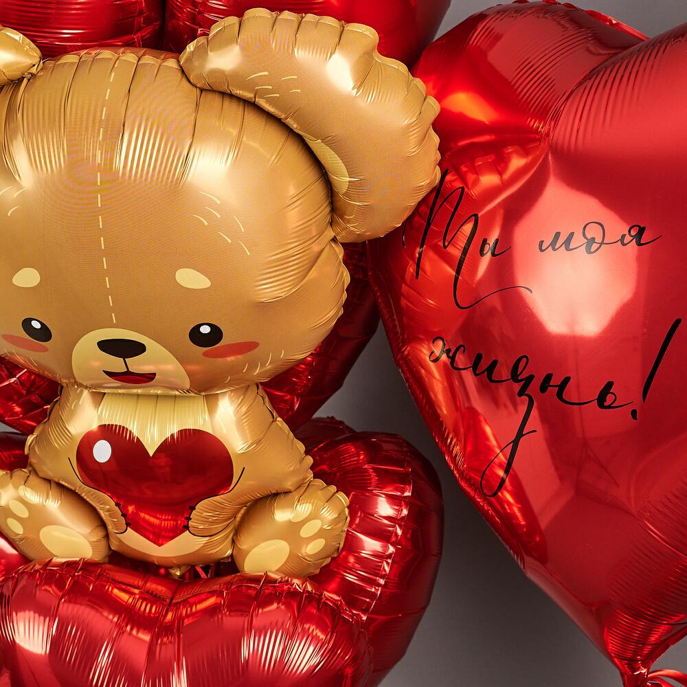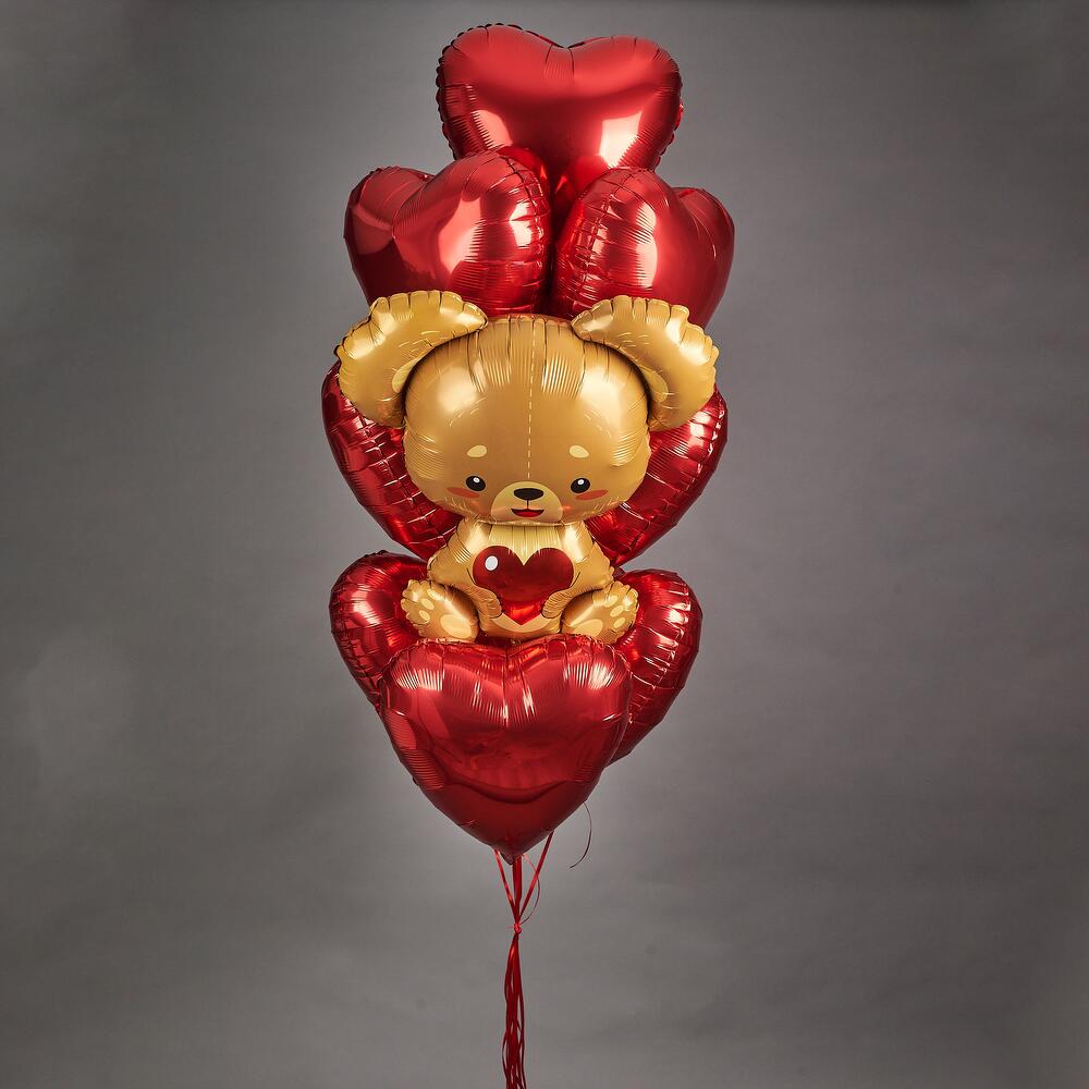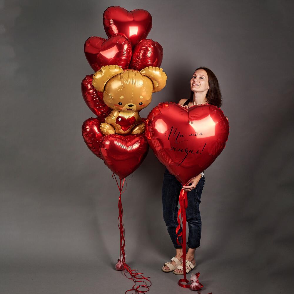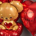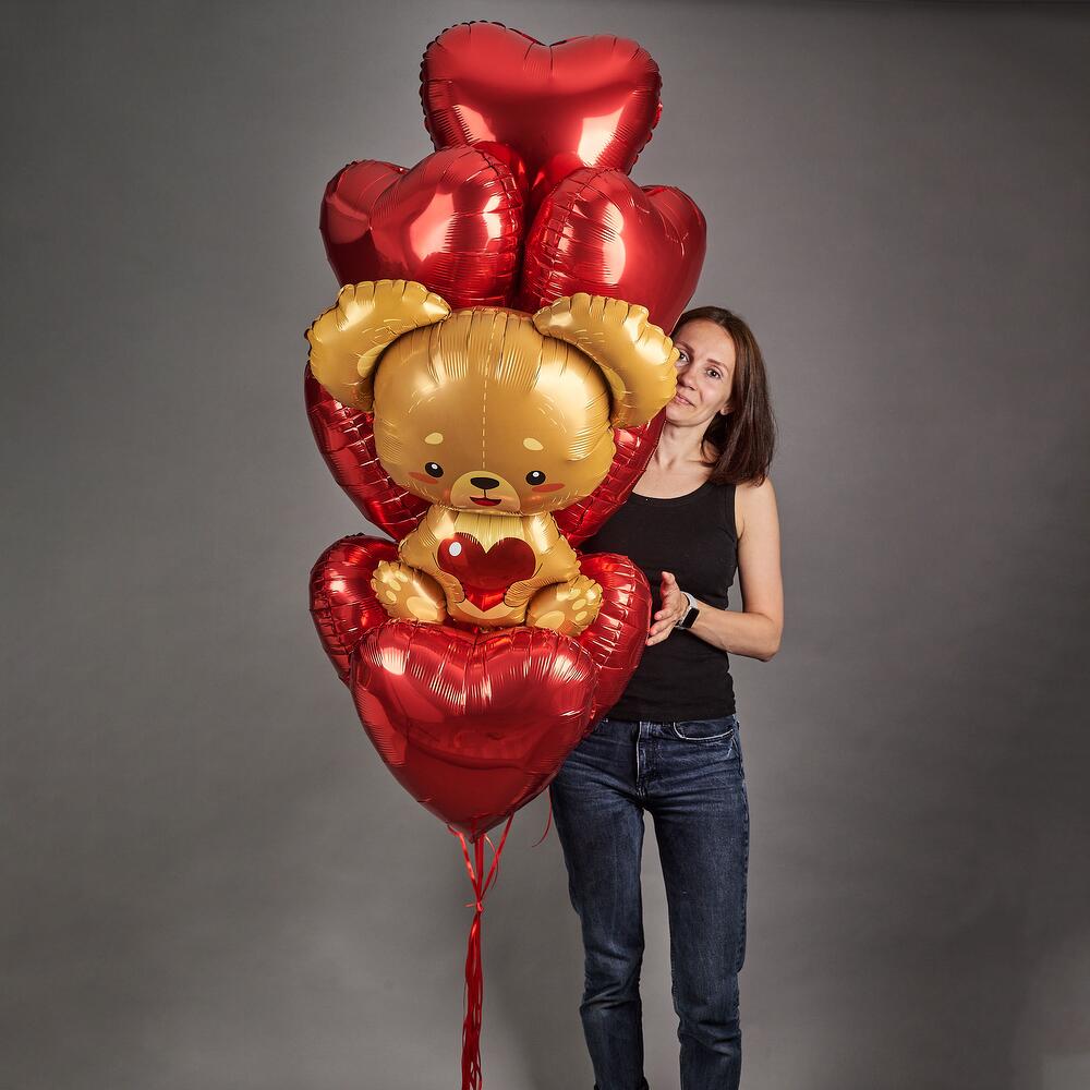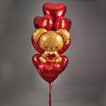 Набор шаров с мишкой. 9 сердец 45см. на атласной ленте+ мишка на атласной ленте В набор входит грузик, транспортировочный пакет. Используем только качественные шары известных производителей ! Не оставляйте шары в транспортировочном пакете , у кондиционера , отопительных и увлажнительных приборов, это влияет на полёт .