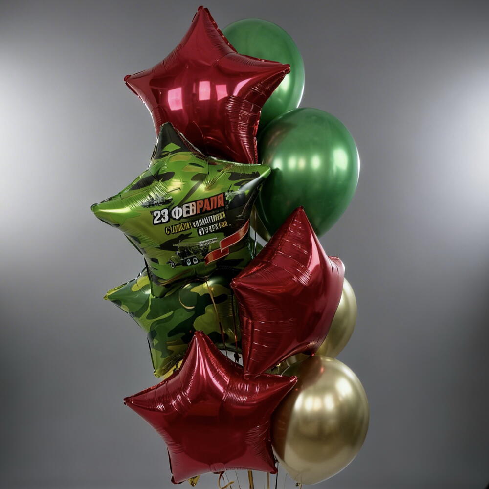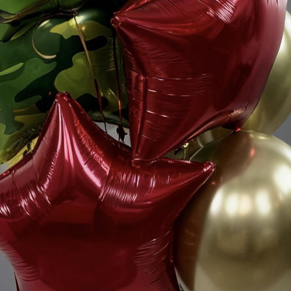 В наборе: 1 звезда тематическая, 1 звезда камуфляж, 3 красные звезды, 6 шаров хром (зеленый, золотой), грузик Шары к 23 февраля