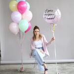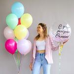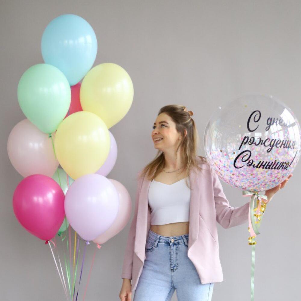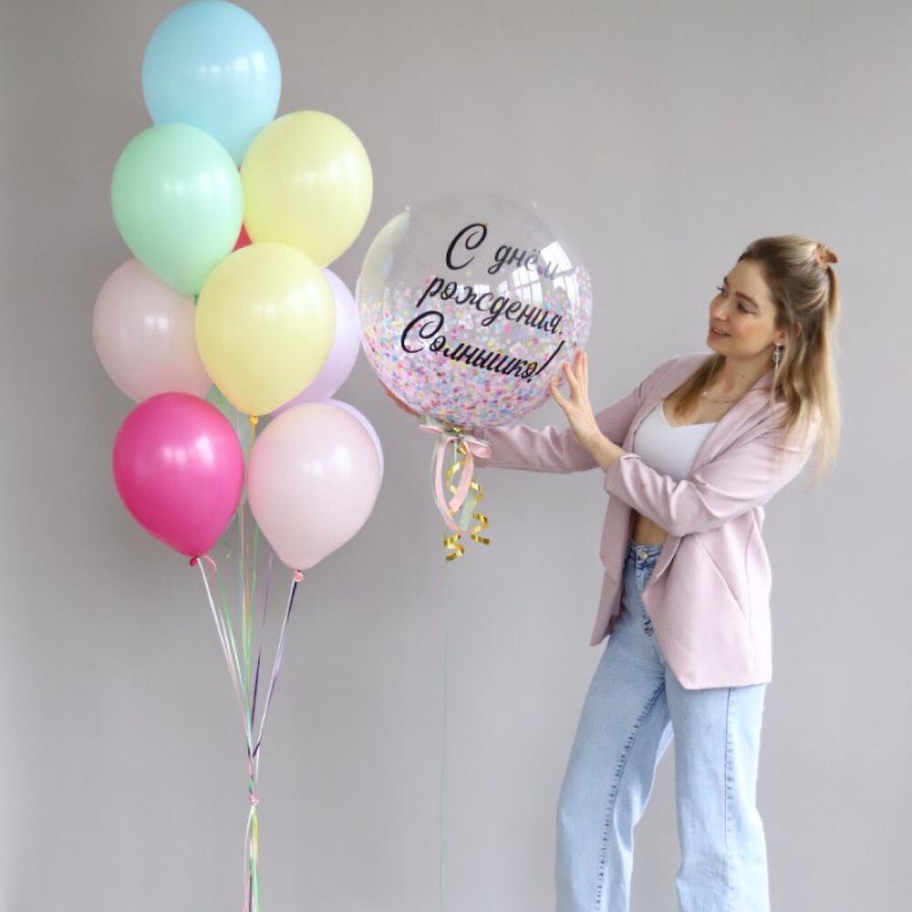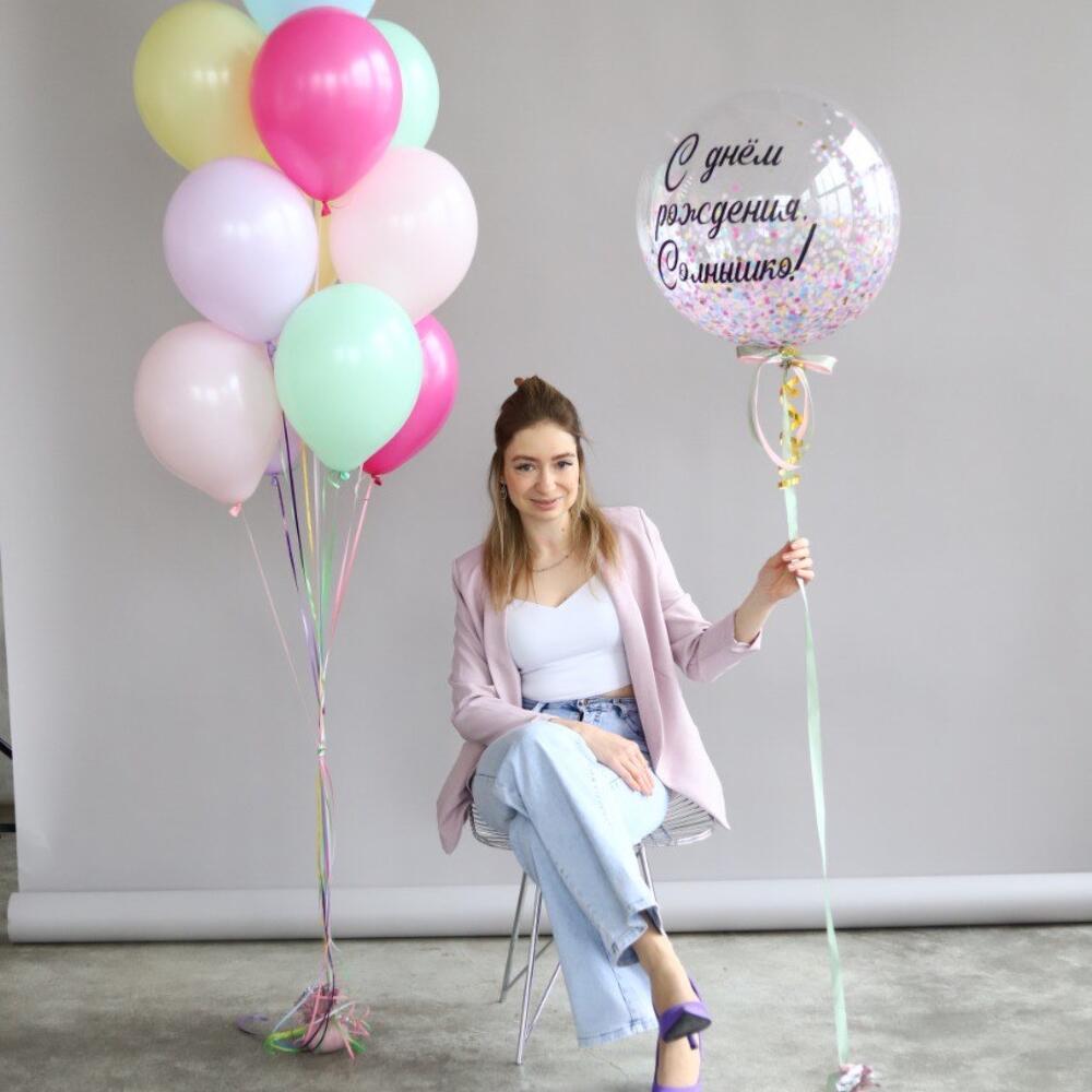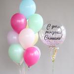 Состав набора: шар-баблс - размер - 60 см, 10 воздушных шариков в фонтане - размер - 30 см. Красивый и яркий набор воздушных шаров на День рождения! Вы можете выбрать любую надпись!