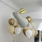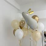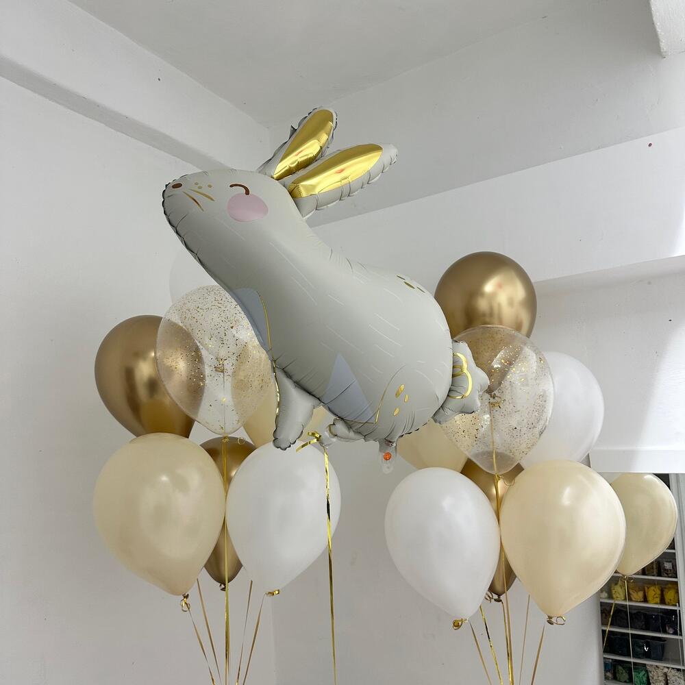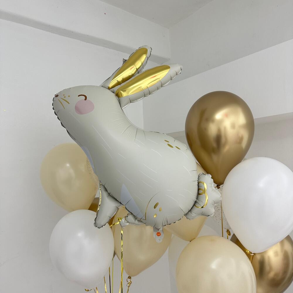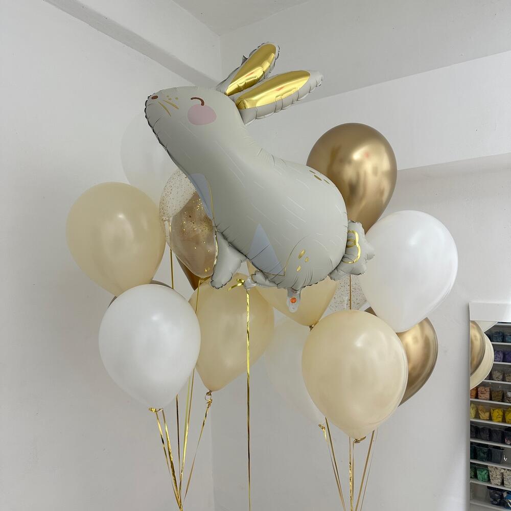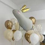 Стильный сет воздушных шаров пастельных бежево белых оттенков с зайчиком подойдет как на выписку из роддома, так и на день рождения любимой девушке, подруге, маме, сестре или ребенку. Смотрится очень нежно. В наборе: 14 воздушных латексных шариков, надутых гелием (беж, белый, золото, конфетти) 1 зайка 75 см Бережно доставим в транспортировочном пакете с грузиком Открытку подпишем и приложим бесплатно