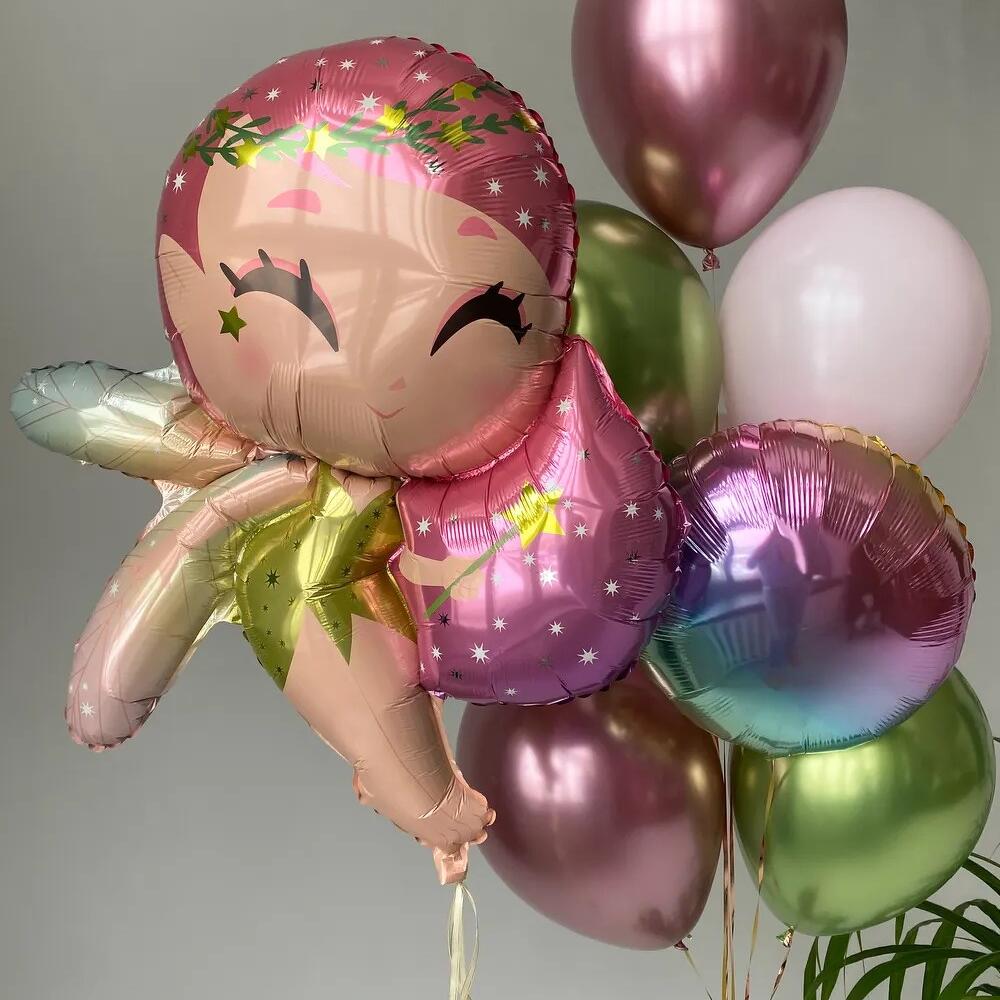 В стоимость входит: -1шт фольгированная фигура Фея 91см -1шт фольгированный круг, 46см -7шт латексный шар, 35см -1шт грузик *Все шары обработаны для долгого полета и надуты гелием. Заказ будет доставлен в плотном прозрачном транспортировочном пакете.