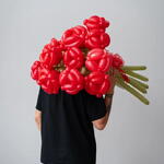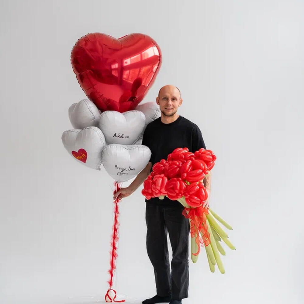 Этот изысканный сет воздушных шаров — воплощение романтики и нежности, идеально подходящее для признания в любви или украшения романтического мероприятия. В композиции гармонично сочетаются два элемента: Букет из фольгированных шаров: Центральный акцент — большой блестящий шар в форме сердца насыщенного красного цвета. Его глянцевая поверхность отражает свет, создавая эффект драгоценного камня. Окружение — группа белых шаров в форме сердечек, которые добавляют композиции лёгкости и воздушности. Детализация: на некоторых белых шарах нанесены трогательные надписи и маленькие красные сердечки, усиливающие романтическую тематику. Декор: шары соединены изящной красной лентой с перьями, что придаёт комплекту завершённость и динамику. Букет из шаров в виде роз: Форма: искусно скрученные шары формируют объёмные «розы» ярко-красного цвета, имитируя лепестки настоящих цветов. Стебли: выполнены из длинных зелёных шаров, создающих эффект натуральных стеблей. Оформление: букет перевязан красной лентой, гармонирующей с остальными элементами сета. Особенности композиции: Цветовая гамма: сочетание красного и белого цветов символизирует страсть и чистоту чувств. Баланс: крупные и мелкие элементы создают объём и глубину, делая композицию визуально интересной. Тематика: сет идеально подходит для Дня святого Валентина, годовщины, свадьбы или романтического свидания. Эффектность: благодаря сочетанию фольгированных шаров и «цветочного» букета, композиция выглядит роскошно и празднично. Состав сета: - 8 шт фольга сердце - Сердце фольга 90 см Букет ШДМ + бант из Фатина: - 11 шт цветков Этот сет не только украсит любое событие, но и станет ярким акцентом в фотосессии, запечатлевшим тёплые моменты любви и заботы. 💖