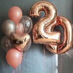 В стоимость входит: -2шт шар фигура цифра, 110 см розовое золото -1шт шар фигура сердце, 46см розовое золото -2шт латексный шар кристалл,30см с конфетти -3шт латексный шар металлик,30см розовое золото -2шт латексный шар хром,30см античное золото -3шт грузик *Цифры можно заменить (напишите в комментариях). Все шары обработаны для долгого полета и надуты гелием. Заказ будет доставлен в плотном прозрачном транспортировочном пакете.