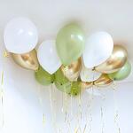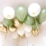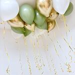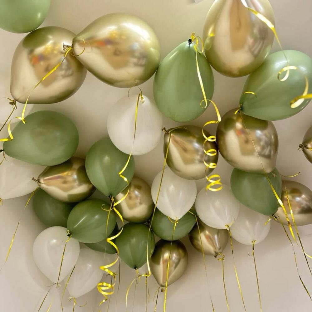 Типы воздушных шаров: Латекс Зеркальный хром Латекс пастель 🤍Цвет: Белый пастель Оливковый пастель Золото хром Размер шаров: 35 см Цвет лент: Золото Мин. количество для продажи 15 шт