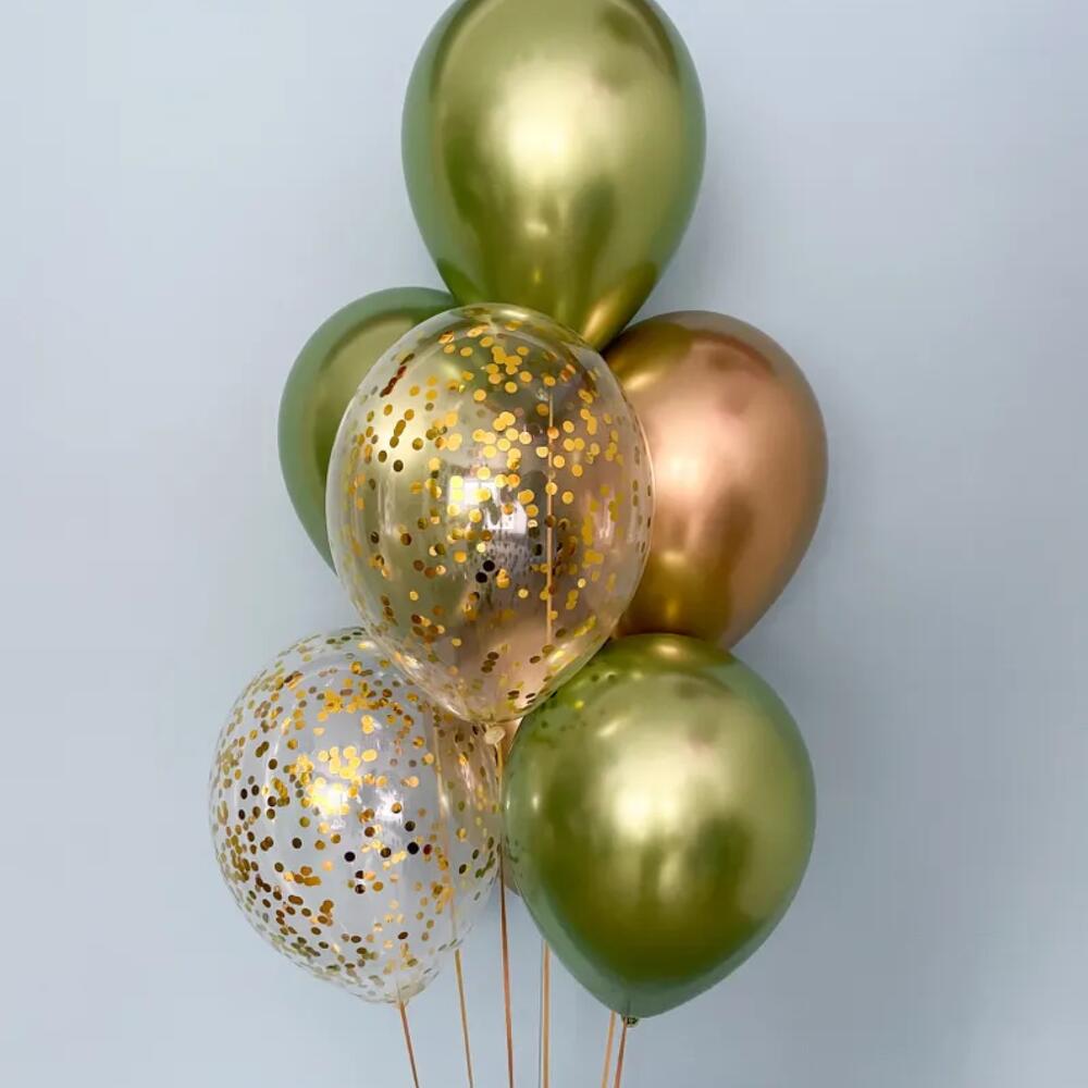 В стоимость входит: -2шт латексный шар, 35см хром золото -2шт латексный шар,35см с конфетти золото -3шт латексный шар, 35см хром зеленый -1шт рузик