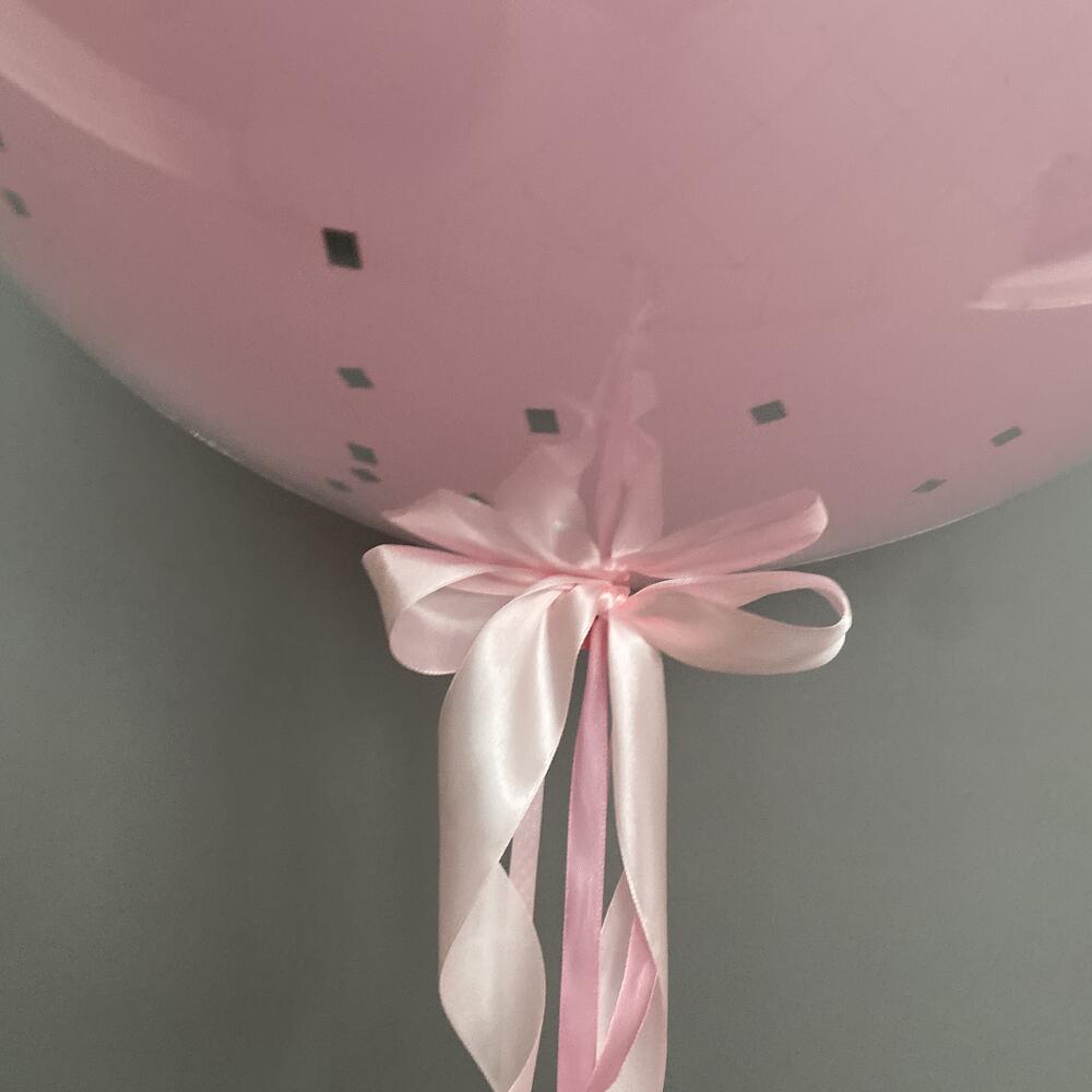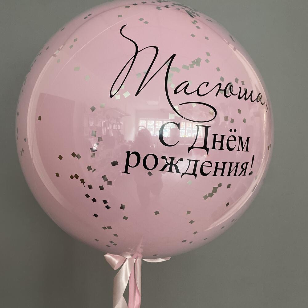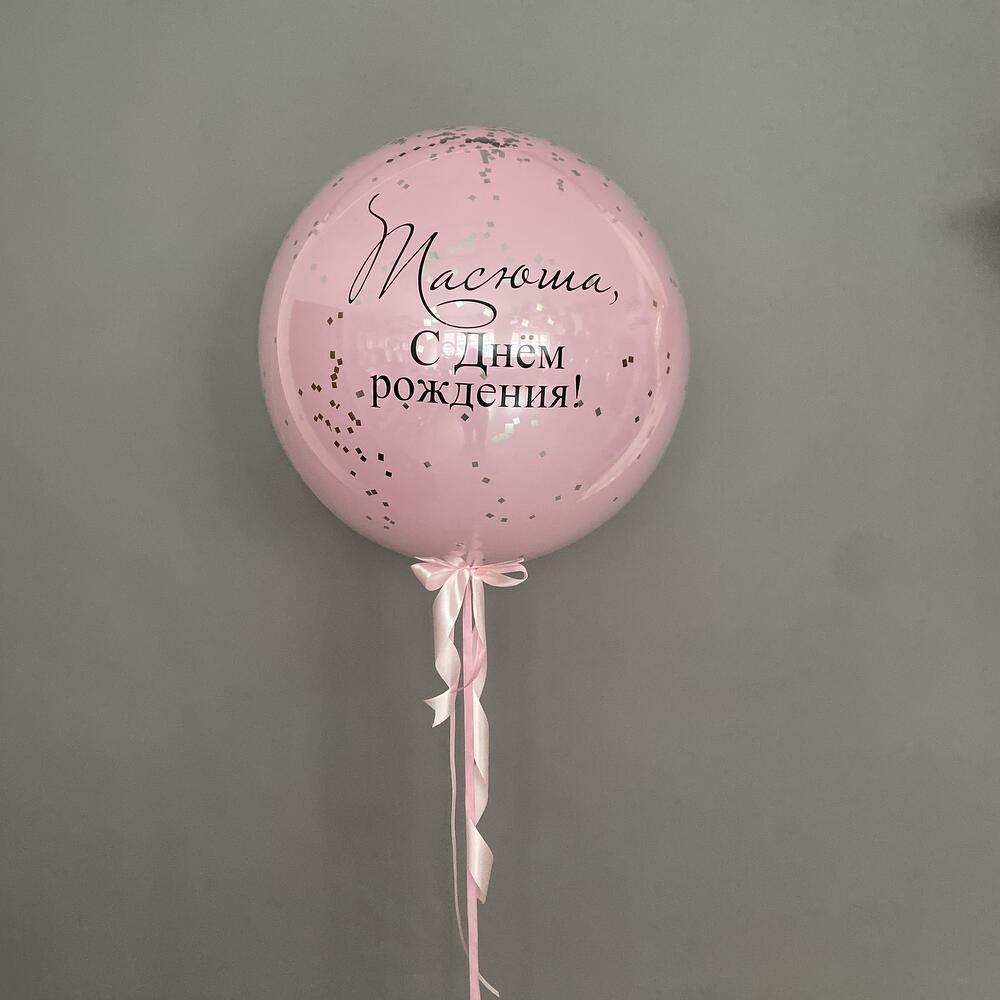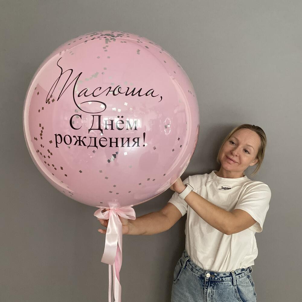 Шар большой розовый с конфетти серебро и индивидуальной надписью 60 см