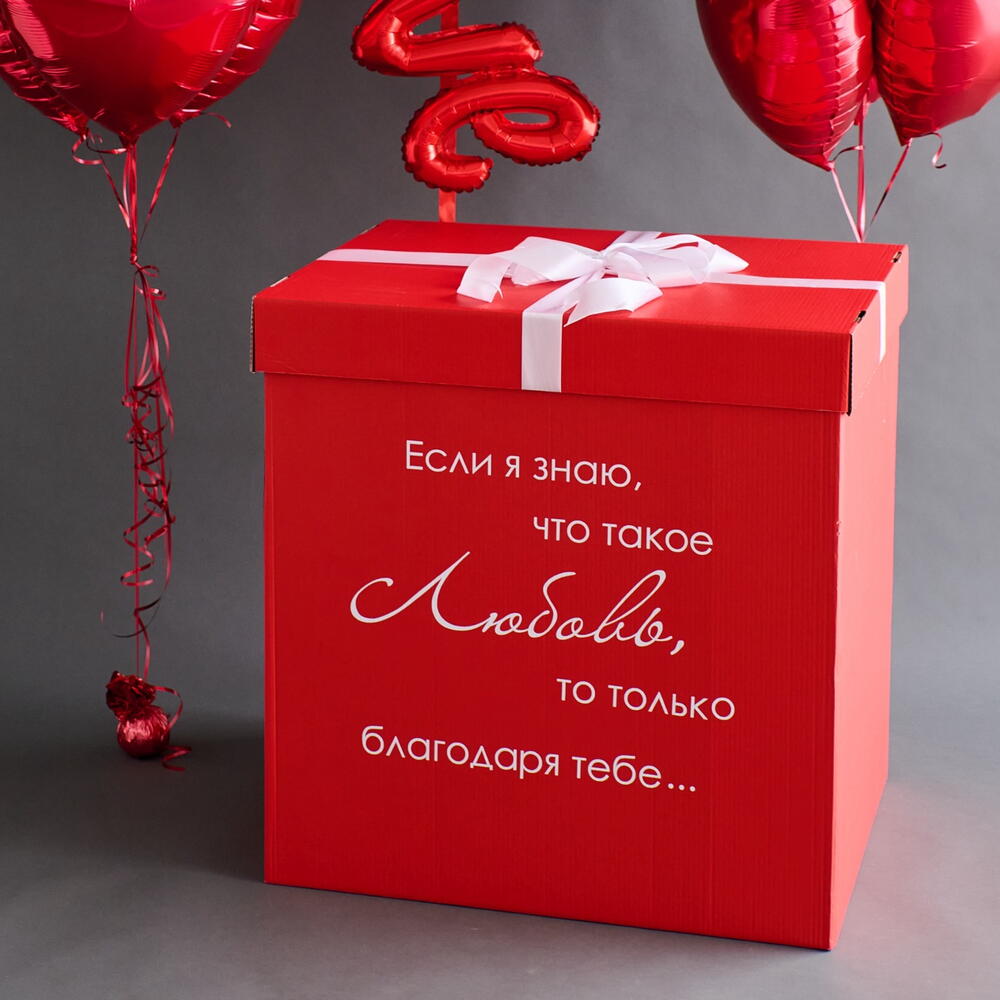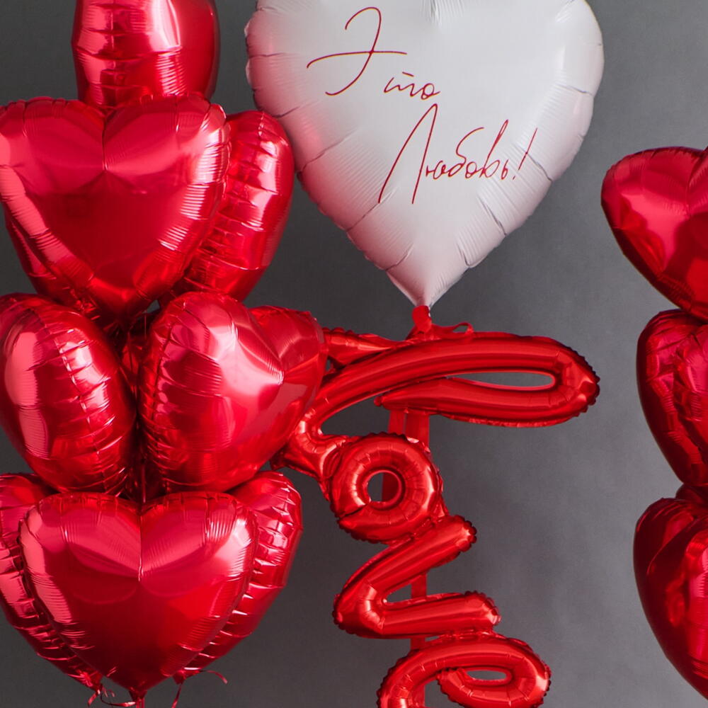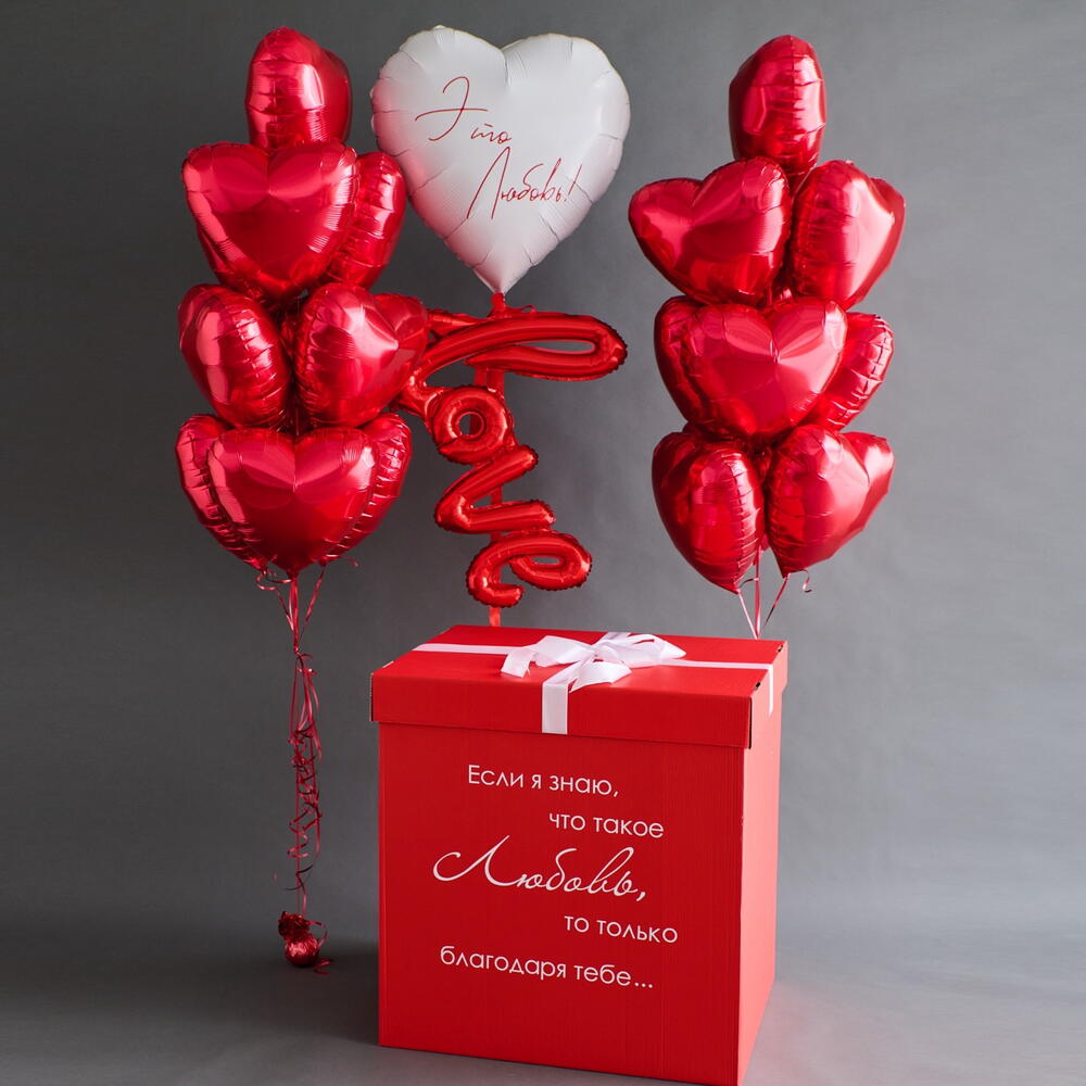 Состав сета: - коробка красная 70*70*70 см с бантом и индивидуальной надписью - 1 шт - фольгированное сердце белое 81 см с индивидуальной надписью - 1 шт - фольгированная надпись красная «Love» - 1 шт Два фонтана по 10 шаров, в каждом: - фольгированное сердце красное 46 см - 10 шт