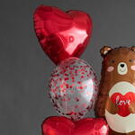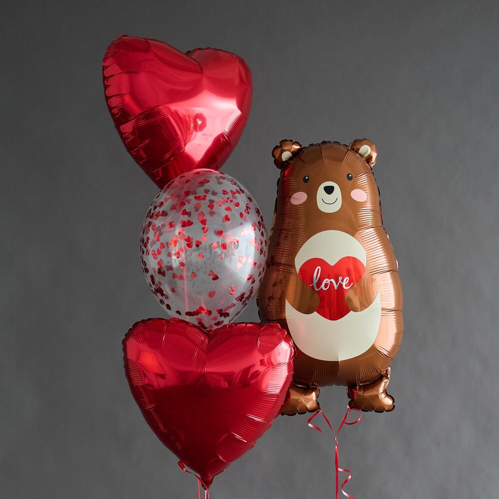 Состав сета: - шар фольга «Мишка» - шар фольга сердце красное 46 см - 2 шт - прозрачный латексный шар с конфетти