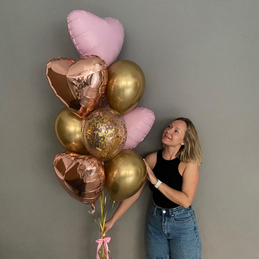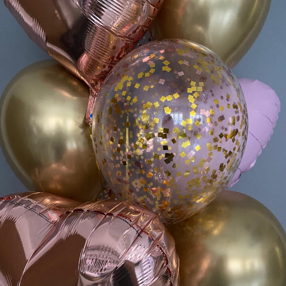 ✅фонтан : - 3 шара с конфетти микс: золото и розовое золото 30 см - 3 шара хром золото 30 см - 2 сердца розовое золото 40 см - 2 сердца розовых 45 см *заказ будет доставлен в плотном прозрачном пакете для транспортировки