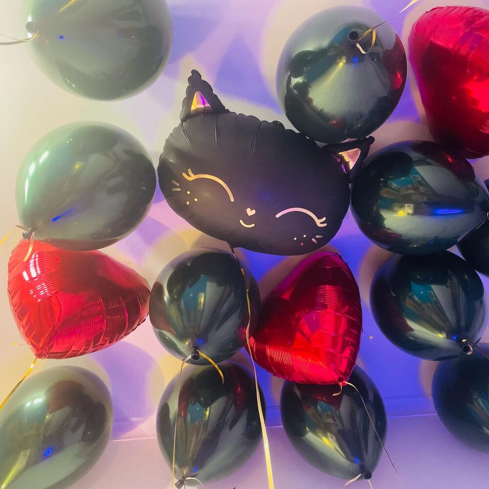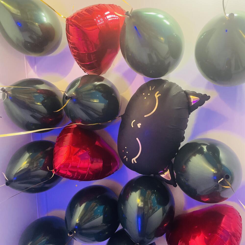 В набор входят: 11 Шаров зеленый кристалл 3 фольгированных красных сердца 1 фольгированная черная кошка