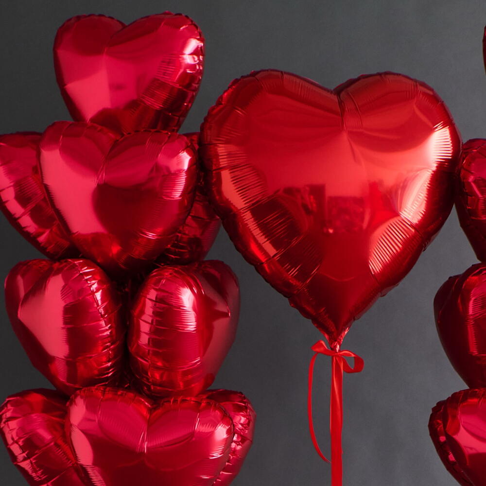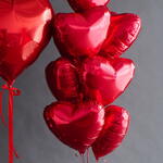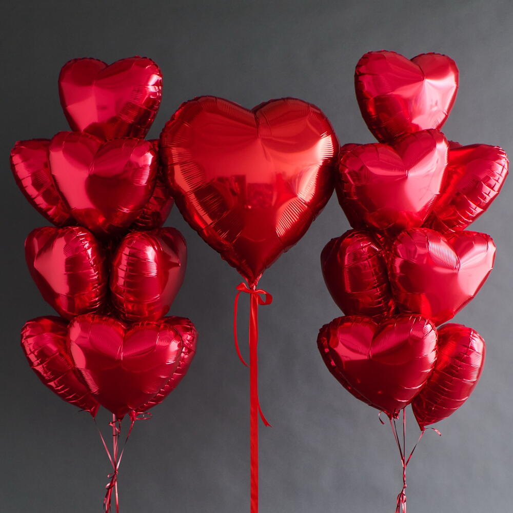 Состав сета: - фольгированное сердце красное 81 см - 1 шт Два фонтана по 10 шаров, в каждом: - фольгированное сердце красное 46 см - 10 шт