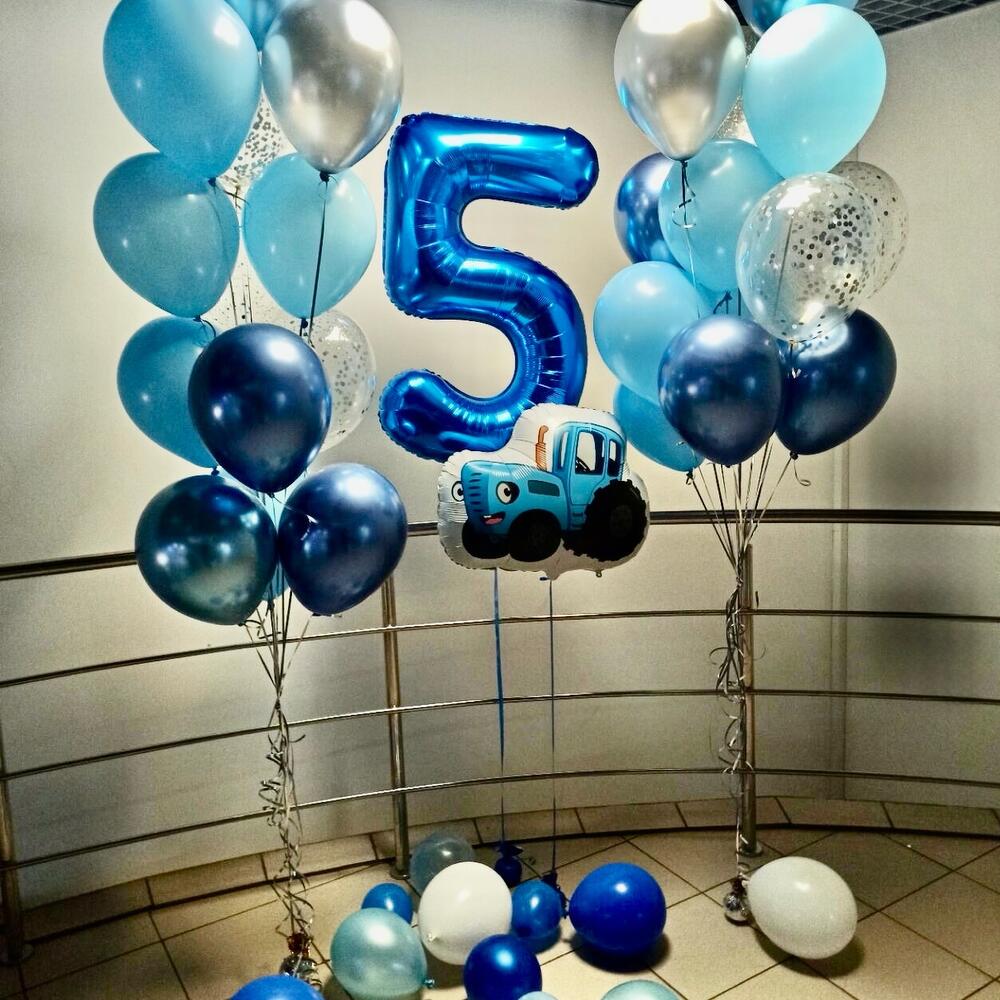 Состав : 1) 2 фонтана по 13 шаров в каждом: 5 голубых латексных шара 30 см в диаметре, 3 прозрачных латексных шаров с серебряным напылением 30.см., 2 латексных шара шара типа хром темно синего цвета 30 см в диаметре, 2 шара латексный светло синего цвета типа хром , 1 шар латексный серебряный 30 . 2) цифра 5 фольгированная синяя высотой 102 см. 3) 1 фольгированная фигурка Синий трактор 70 см. 4) 10 латексный шаров с воздухом 20 см в диаметре.(4 синих и 6 голубых)
