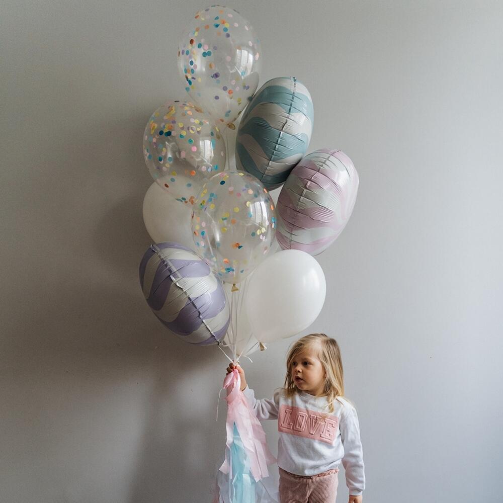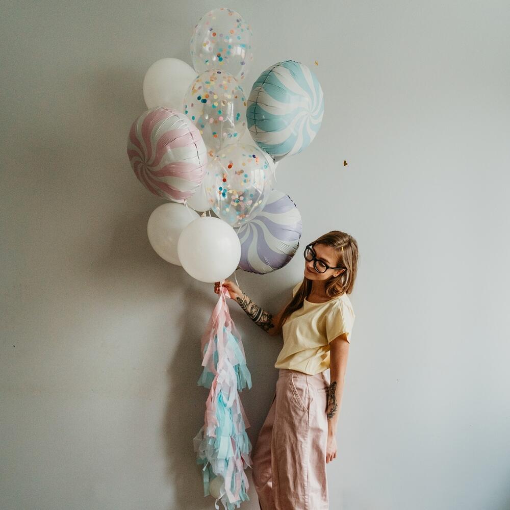 Состав: •шар 30см белый 5 шт; •шар 30см с круглым цветным конфетти 3 шт; •шар 40см розовая конфета; •шар 40см голубая конфета; •шар 40см сиреневая конфета; гирлянда тассел.