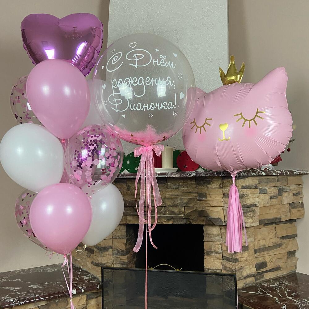 Состав: Кошечка с короной -шар Бабл 60 см с перьями, конфетти, и индивидуальной надписью Фонтан: сердце, 3 розовых шара, 3 белых, 3 с конфетти