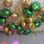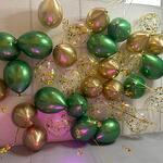 30 шаров с гелием под потолок: - 10 шаров золото хром (30см) - 10 шаров зеленый хром (30см) - 10 шаров прозрачных с золотым конфетти (30см) В комплекте прилагается грузик для шариков. Шары обработаны специальным средством Ultra Hi-Float для продолжительного полёта. Используем только сертифицированный материал европейских производителей. Доставляются шарики воздушные в специальных транспортировочных пакетах. Шарики с гелием бояться сквозняков, кондиционеров, повышенной влажности воздуха и долгого нахождения под жарким солнцем. Мы доставляем радость! Отличного Вам праздника!