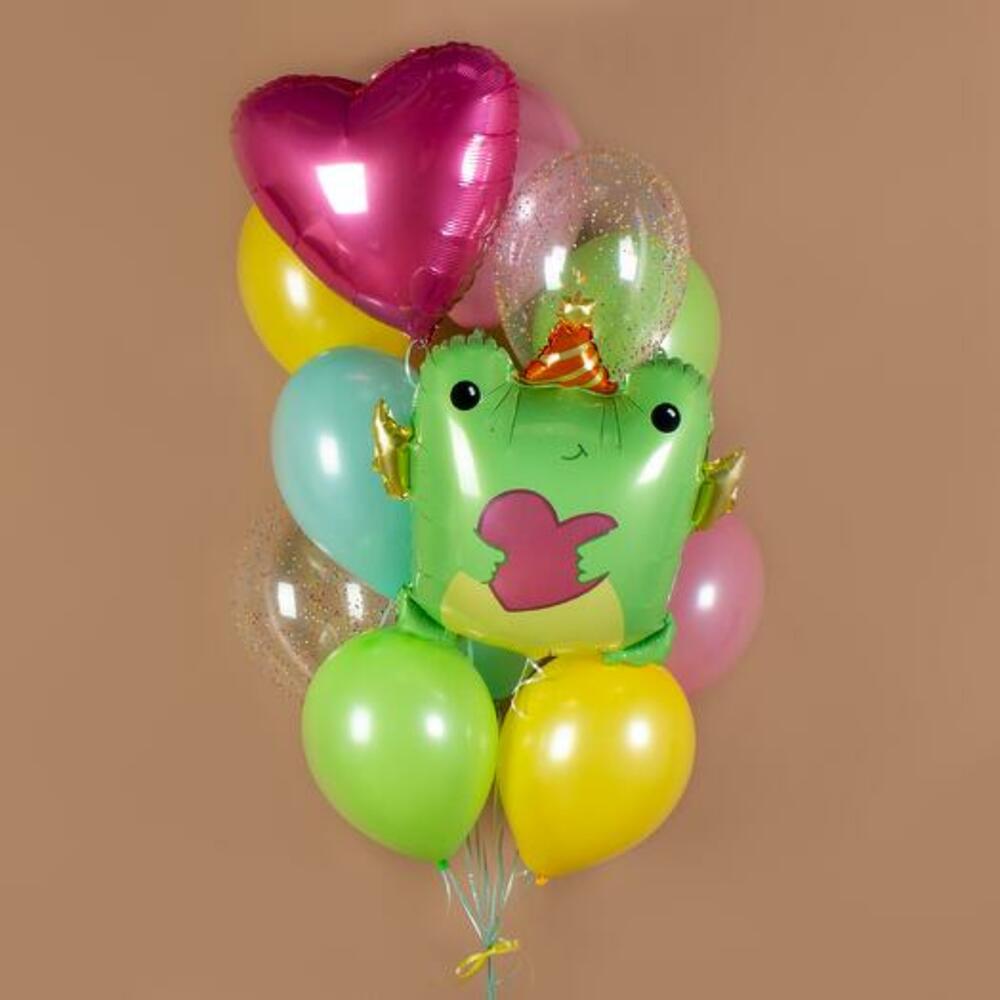 Фонтан с зелёной лягушкой. Шар фольга фигура 60см-1 Шар фольга сердце 40см-1 Шар латекс 30см-9 Грузик Пакет транспортировочный