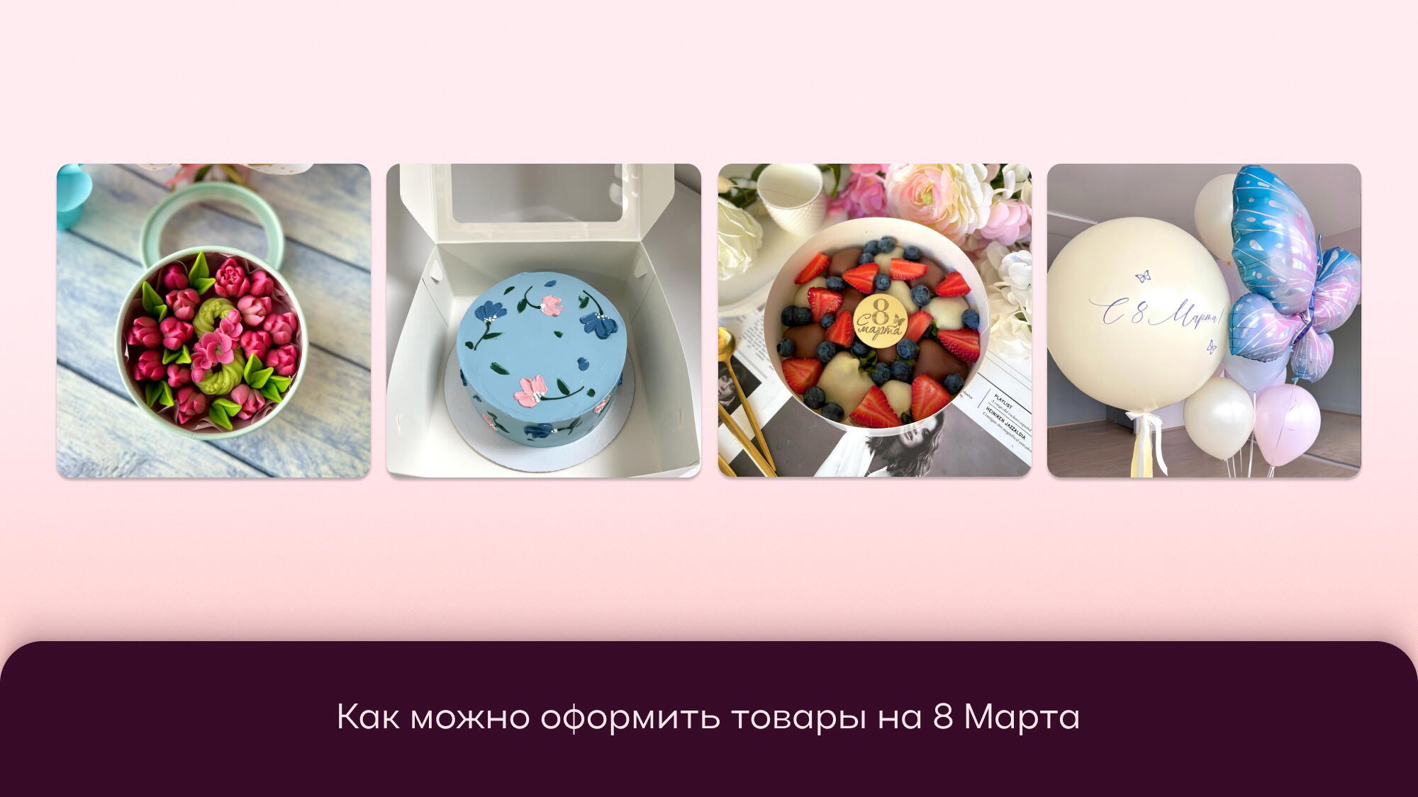 Как и в любой другой праздник, на 8 Марта мы рекомендуем сделать тематическое оформление товаров. Используйте цветочный декор, надписи, связанные с датой, открытки, ленты, шары или топперы. Нежные цвета, узоры, жемчуг, позолота — все, что ассоциируется с весной и женственностью, поможет привлечь внимание. Покупатели на Flowwow выбирают глазами, поэтому ваша карточка должна выделяться среди конкурентов.