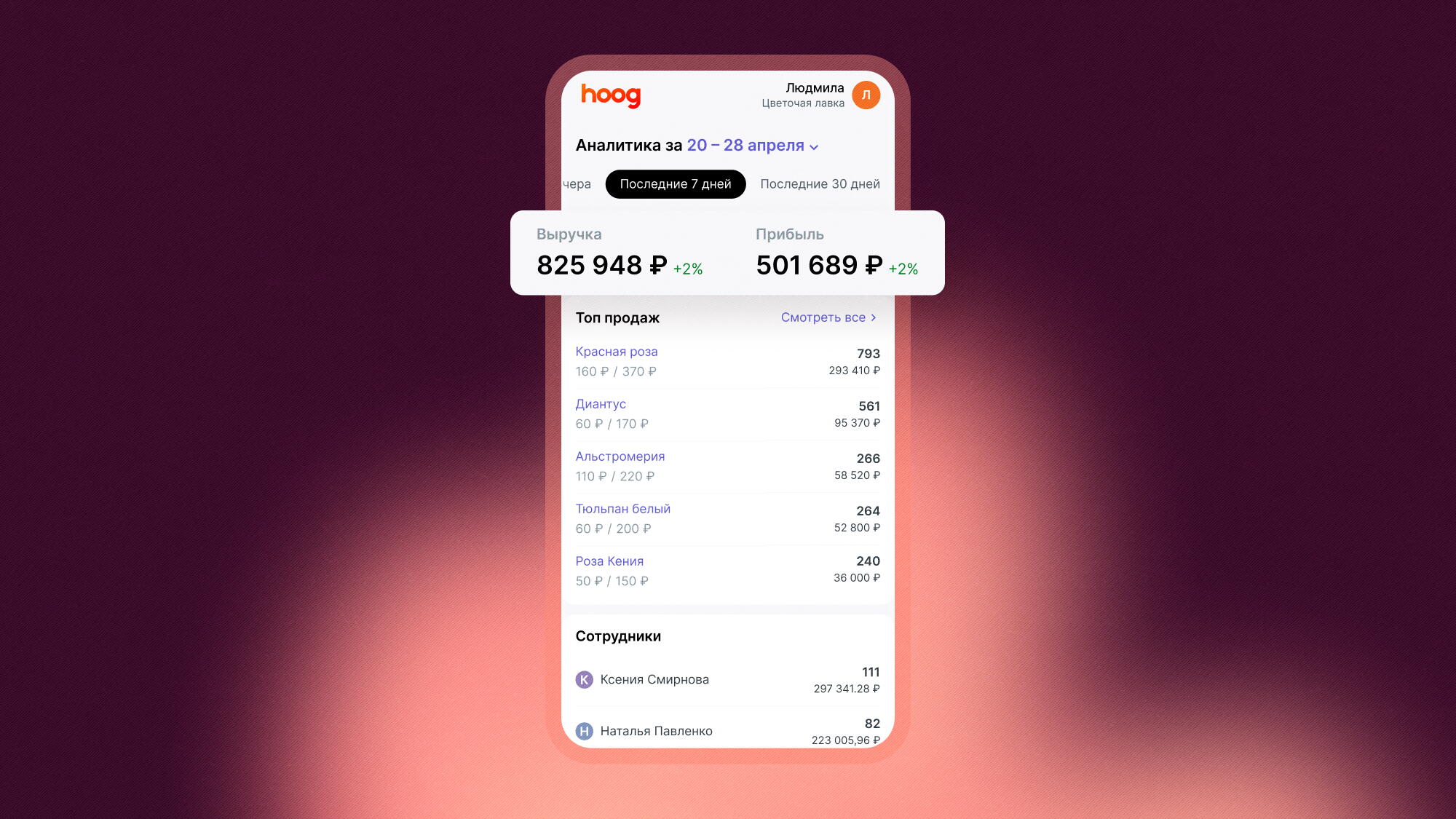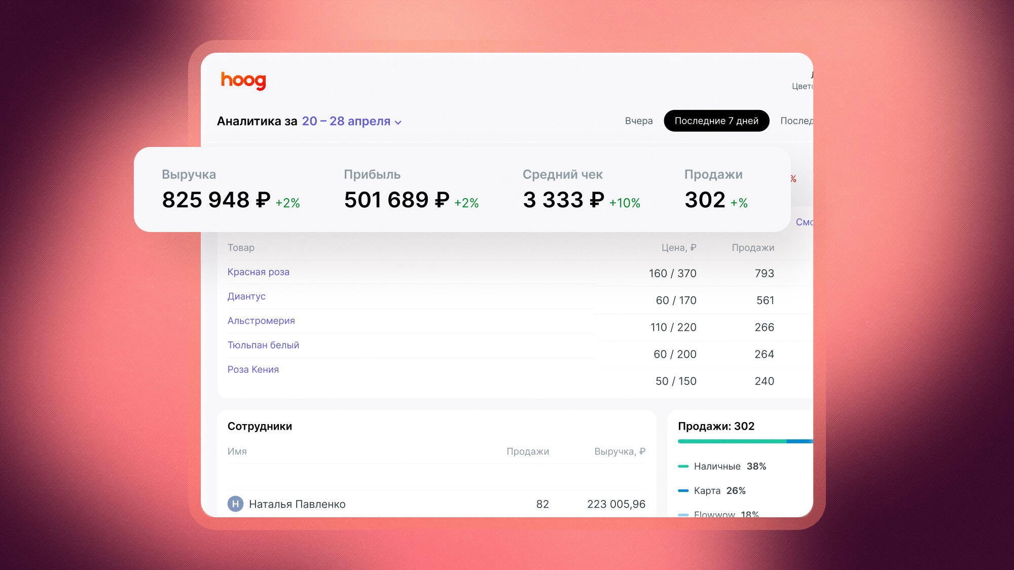 Hoog — это система учета для владельцев цветочного бизнеса, которая позволяет проводить и анализировать продажи, отслеживать количество товара, уменьшать вероятность списаний и пропажи цветов.