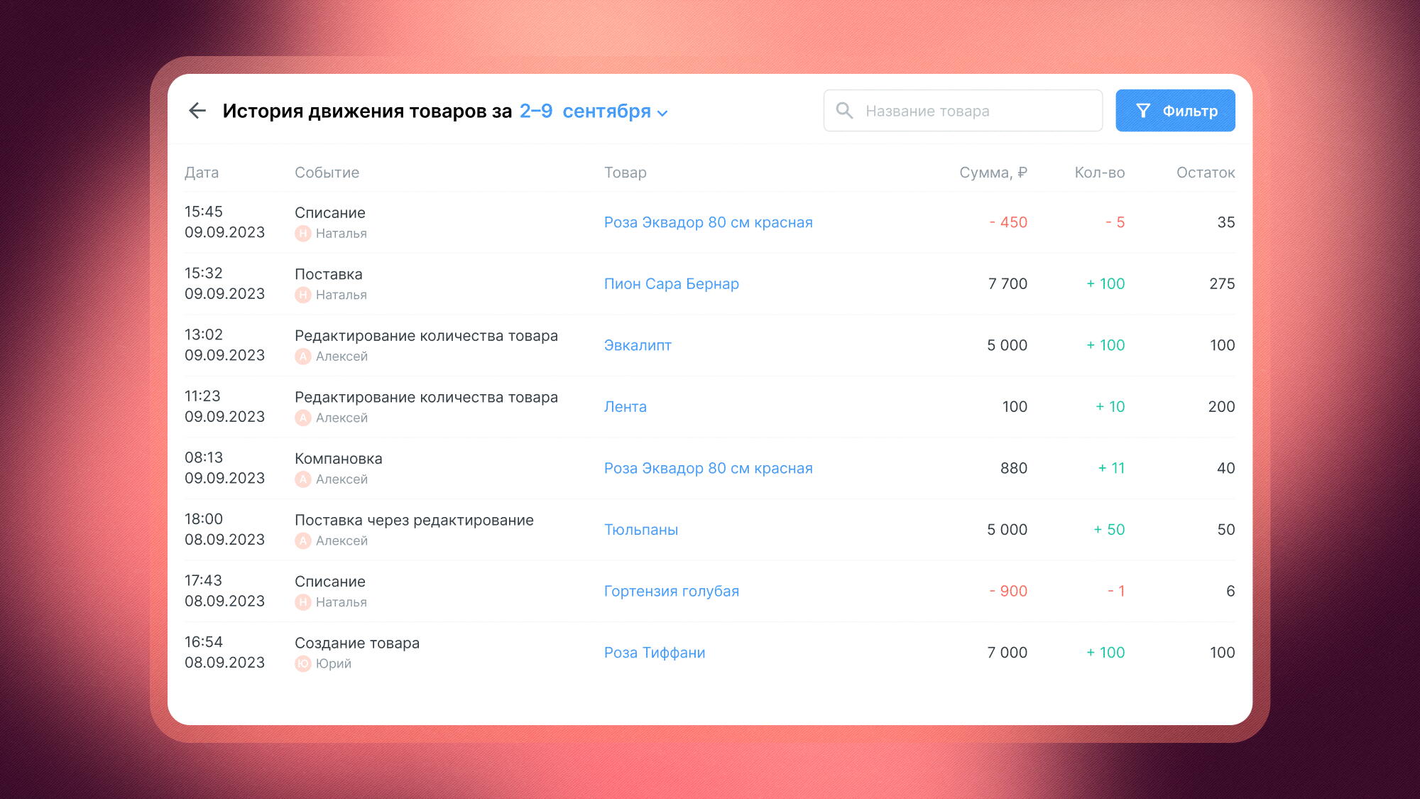 В Hoog легко посмотреть историю движения товаров за любой нужный период.