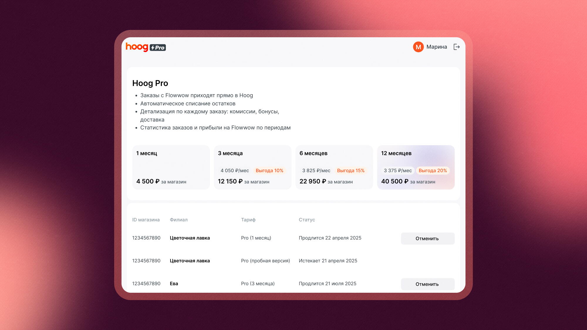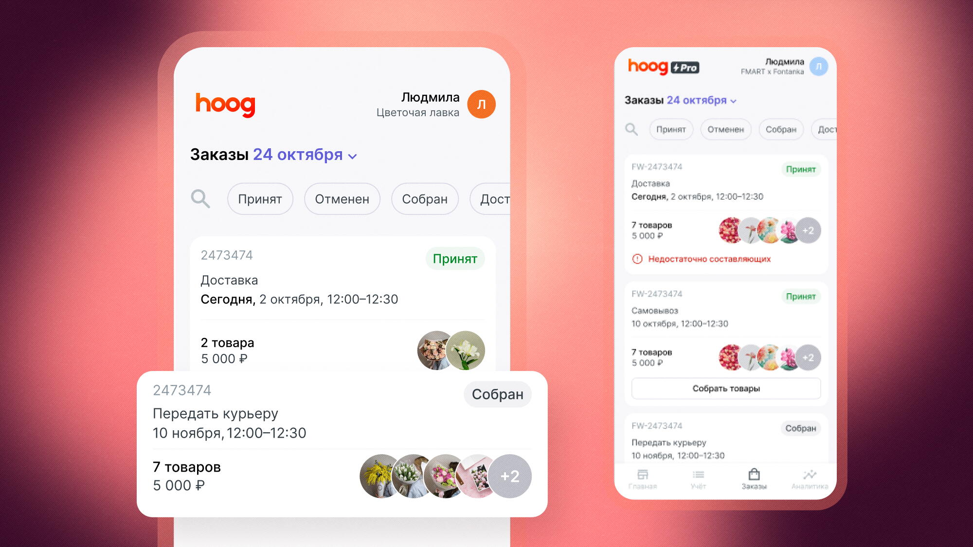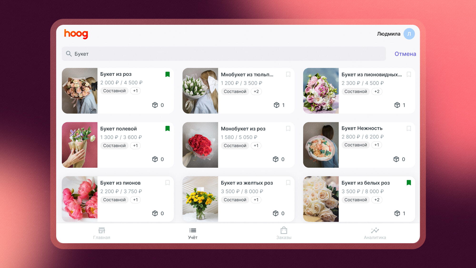 Система учета гибкая — сейчас Hoog пользуются не только флористы: у нас есть пользователи-продавцы и из других категорий товаров, например, магазины косметики и одежды. Если вы заинтересовались Hoog, но не продаете цветы, все равно можете скачать приложение в AppStore или Google Play, зарегистрироваться и бесплатно попробовать.