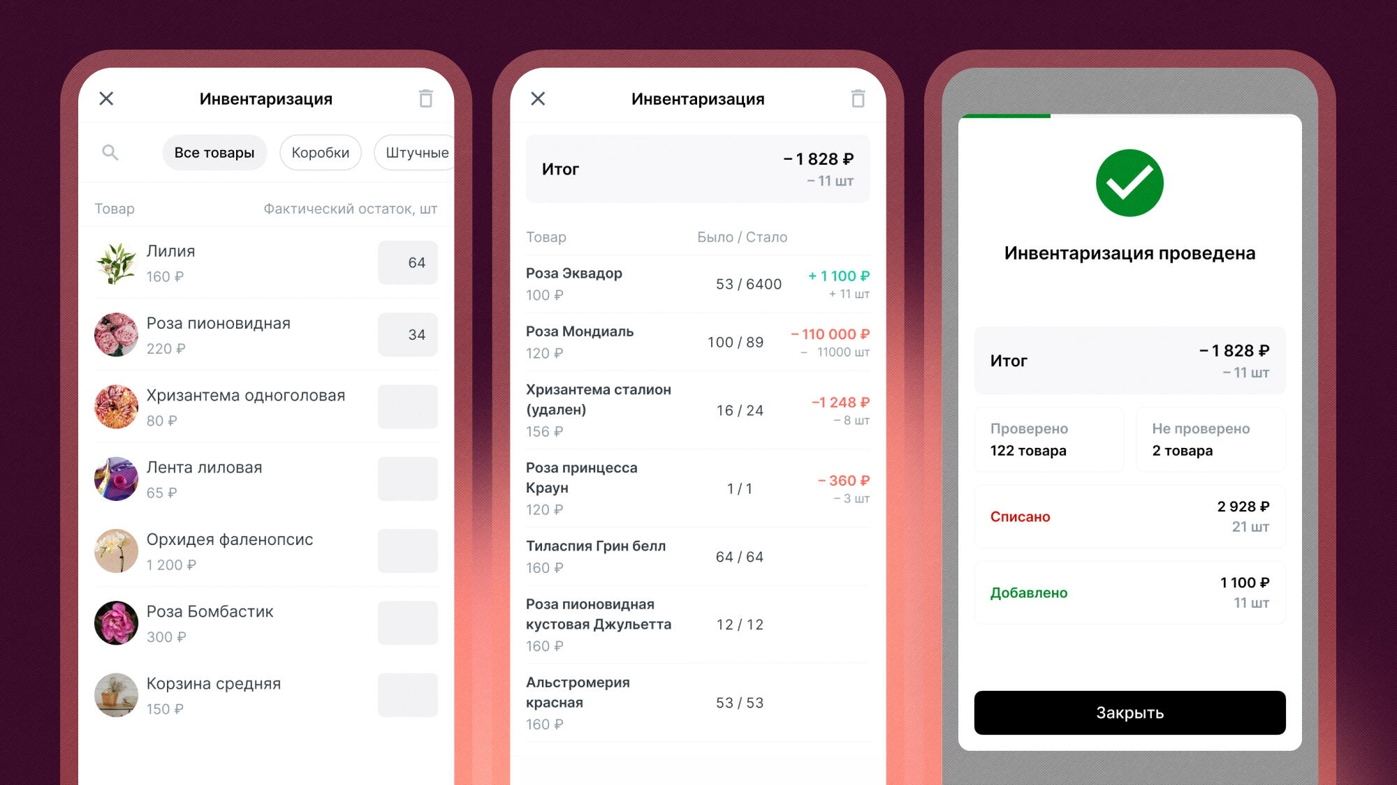 Во время инвентаризации легко списать часть товара и сверить остатки: