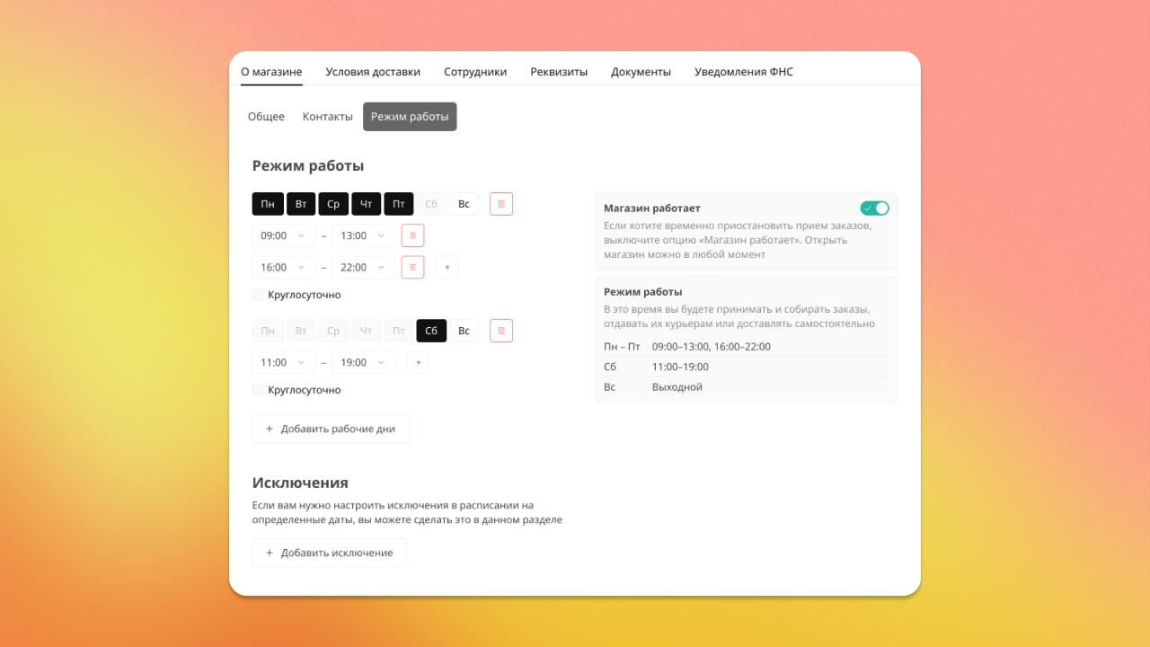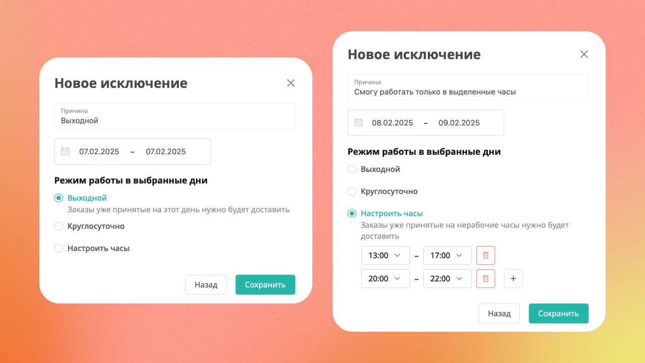 Если ваш обычный режим был с 8 утра до 7 вечера и вы решили продлить рабочее время в какой-то из дней до 9 вечера, то заказы в этот день будут поступать в соответствии с внесенным исключением.