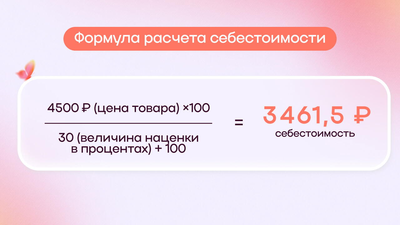 Если наценку мы уже знаем (например, проанализировали рынок и поняли, что на торты она держится на уровне 30%), то можем легко подсчитать себестоимость по формуле:
