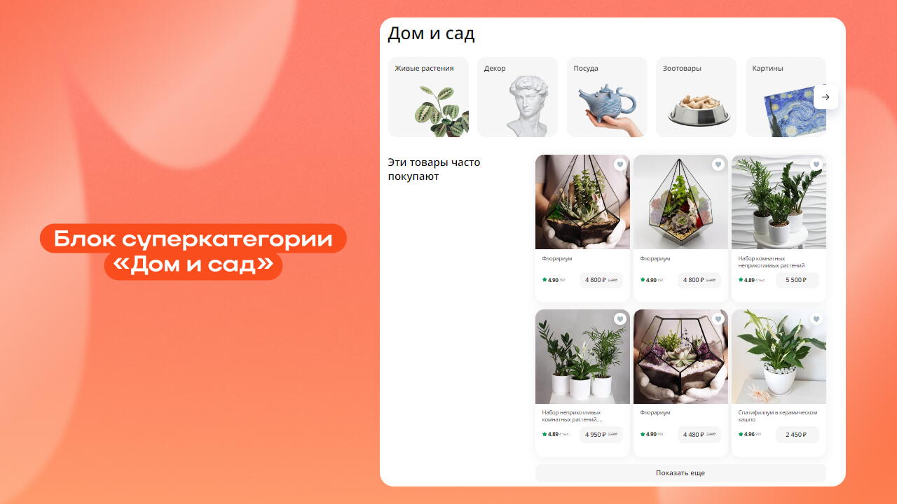 В суперкатегории «Дом и сад»: «Товары рядом с адресом», «Эти товары часто покупают», «Живые растения», «Декор», «Посуда», «Зоотовары», «Хобби и творчество», «Картины».