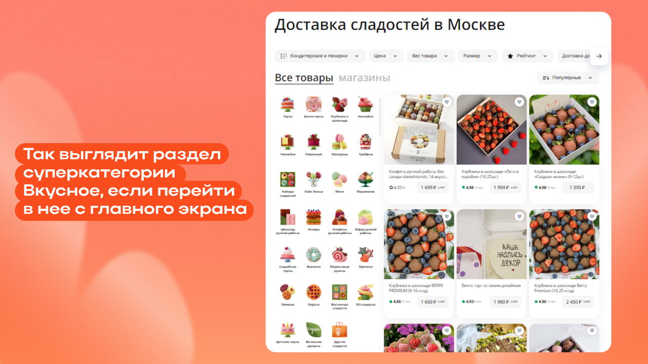 Отображается только в суперкатегории «Вкусное». Выводятся товары из категории «Кондитерские и пекарни» среди ее подкатегорий «Торты», «Веганские десерты», «Пирожные», «Конфеты ручной работы», «Эклеры», «Чизкейки».
