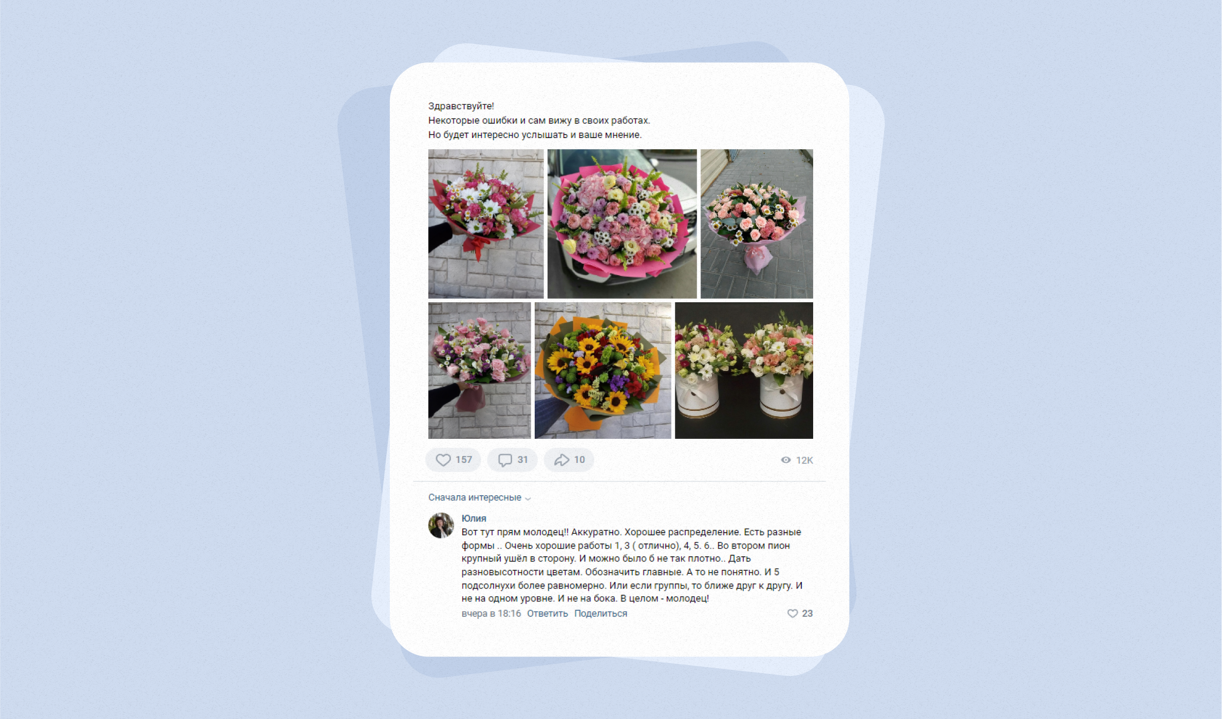 Новички очень часто вступают в профильные сообщества, куда выкладывают свои работы, чтобы получить конструктивную критику от опытных флористов и делать более качественные букеты.