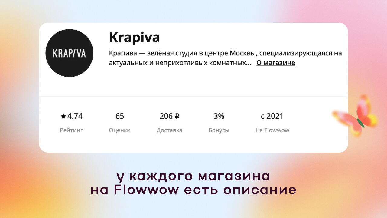 Вот какие вопросы могут возникнуть у клиента и как на них отвечает интерфейс Flowwow. Рассмотрим на примере страницы магазина Krapiva.