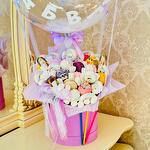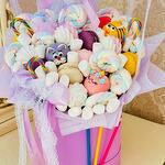 Букет из сладостей — отличная замена традиционной цветочной композиции . Это лучше, чем подарить просто конфеты, и оригинальнее, нежели просто купить цветы. Сладкий букет можно вручать практически по любому торжественному случаю: на день рождения, юбилей, детский праздник , выписку , день учителя, маме , дочке, подруге, бабушке, коллеге, учителю, сестре, девушке, жене , подруге и просто другу . Если тот, кому предназначен букет из зефира , Маршмелло , макарони любит сладкое, презент обязательно вызовет восторг и удивление. Букет из зефира , Маршмелло, макаронс , созданный своими руками, станет отличным презентом и непременно понравится любому адресату. Такой букет придётся по душе как ребёнку, так и взрослому . Вес 2000 гр.