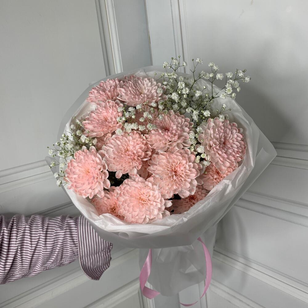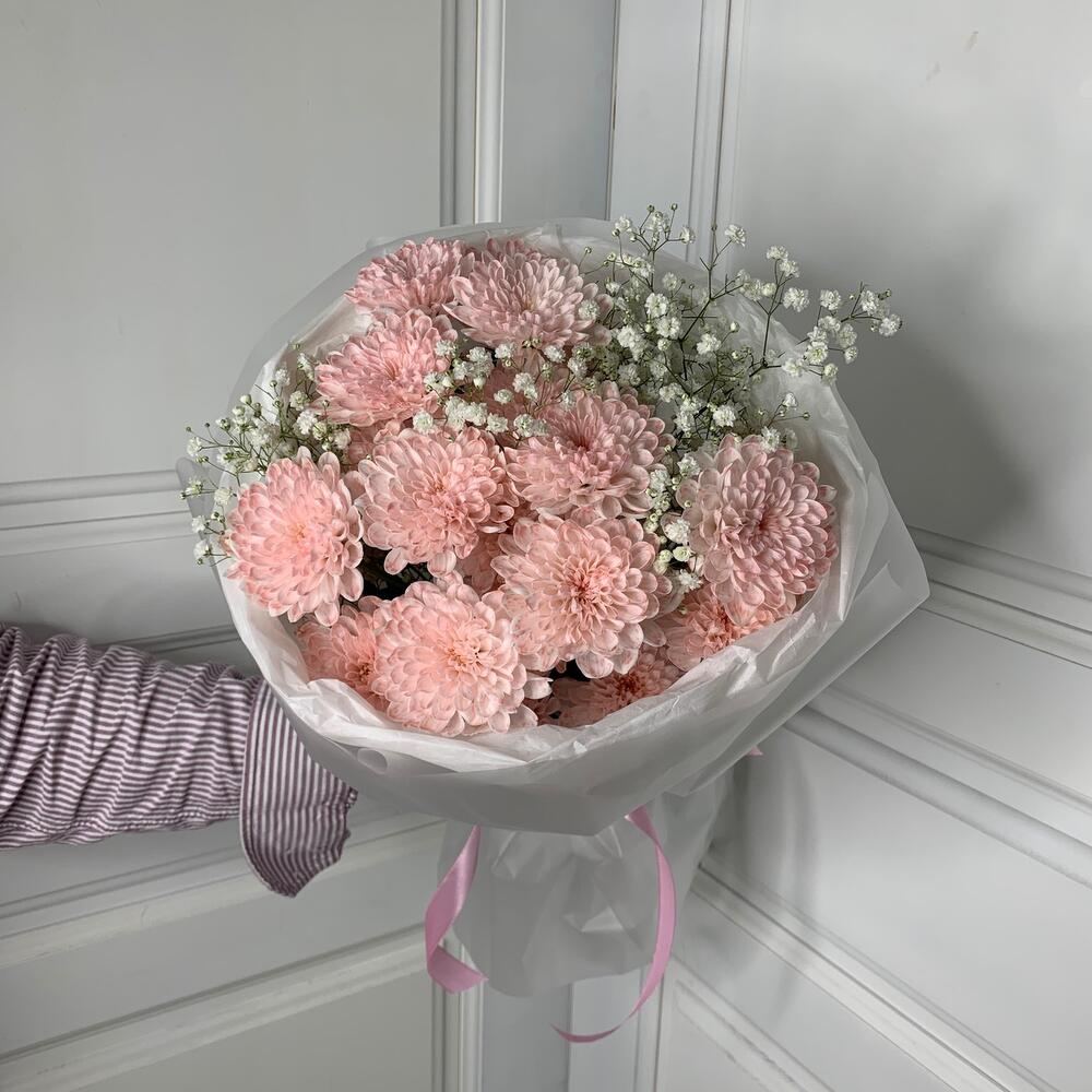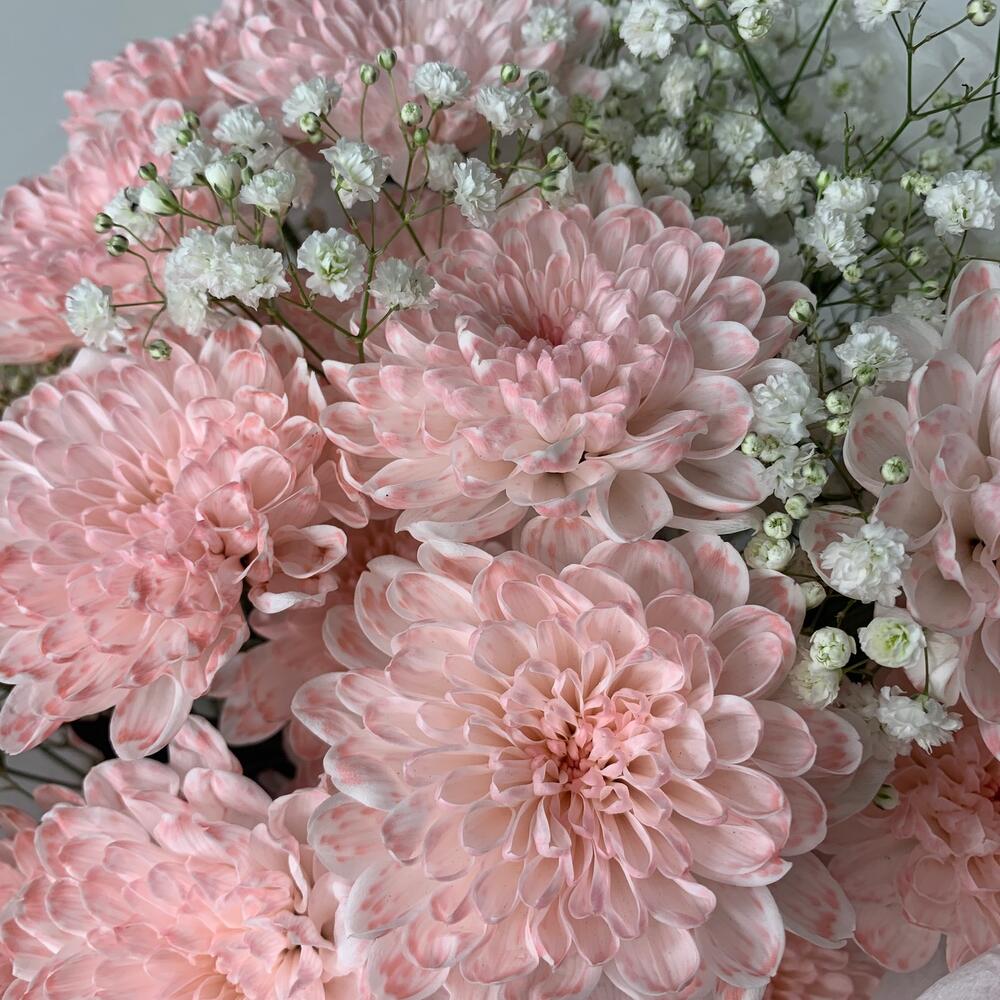 Букет пудровых хризантем и гипсофилы