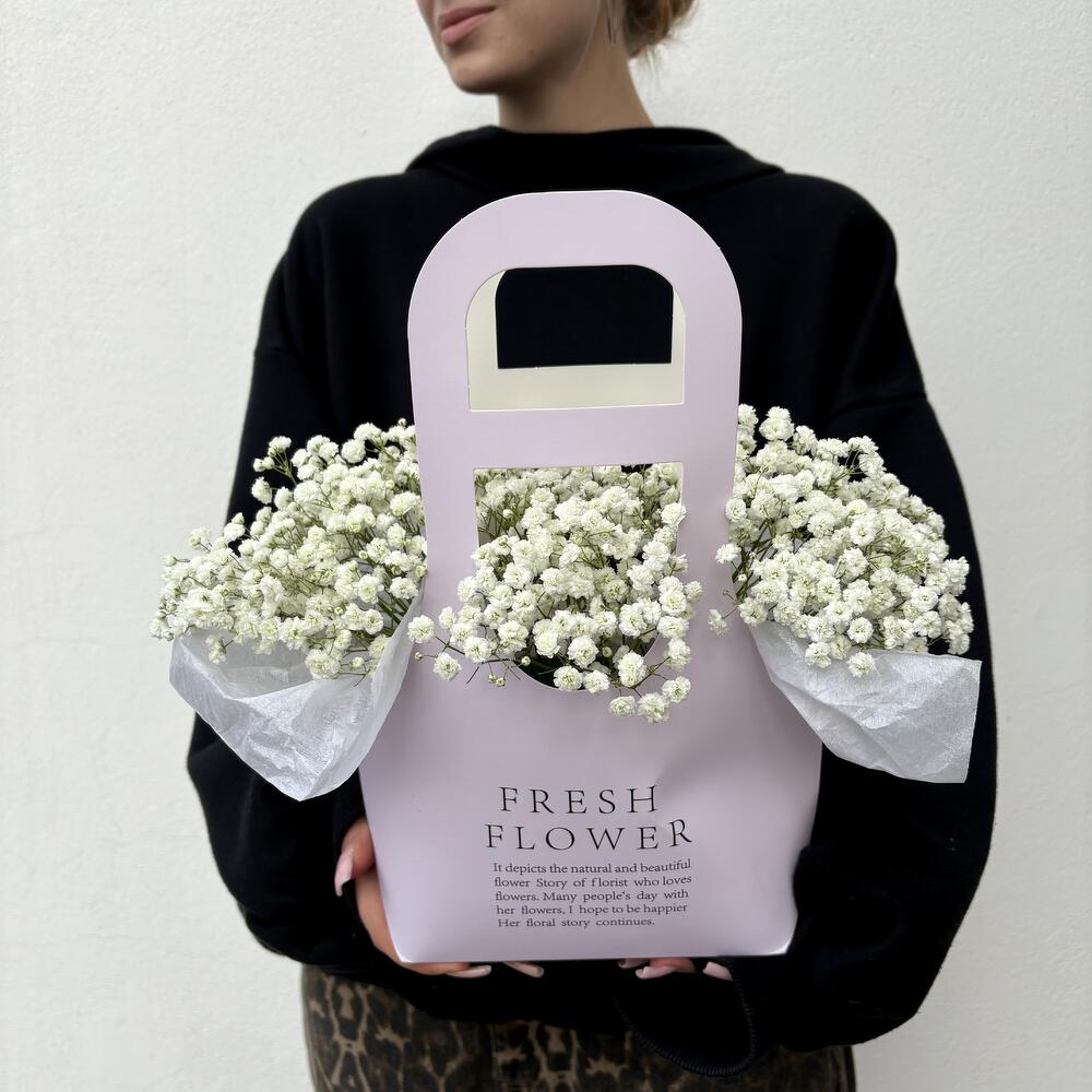 Воздушная композиция из белоснежной гипсофилы в сумочке с ручками, будет долго радовать Вас и Ваших близких🌿