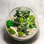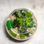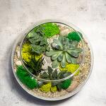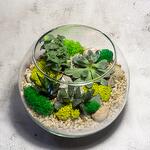 Композиция из суккулентов, украшенная натуральными камнями, стабализировнным мхом и цветным песком. Каждый флорариум уникален. Из разных суккулентов в наличии мы составляем композицию, лучше всего подходящую под форму.