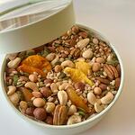 Amêndoa - 100 gr. Avelã - 150 gr. Damascos secos - 2 un. avelã em casca - 50 gr. caju torrado - 150 gr. nogueira em casca - 150 gr. amêndoas em casca - 50 gr. sementes de abóbora - 20 gr. Pecan descascado - 20 gr. anéis secos de abacaxi - 1 un. pêssego seco - 1 un. кедровые орехи - 10 gr. бразильский орех чищенный - 2 un.