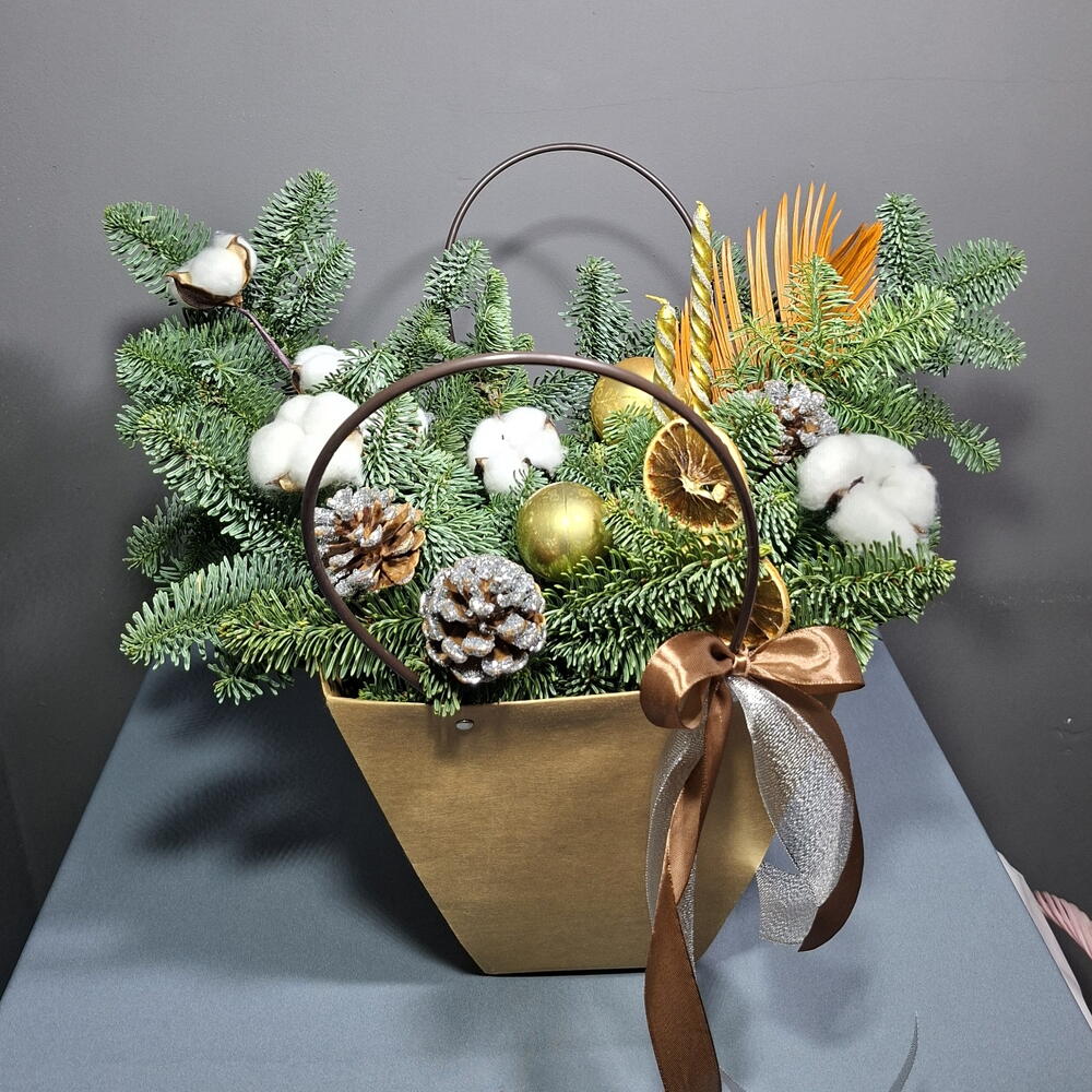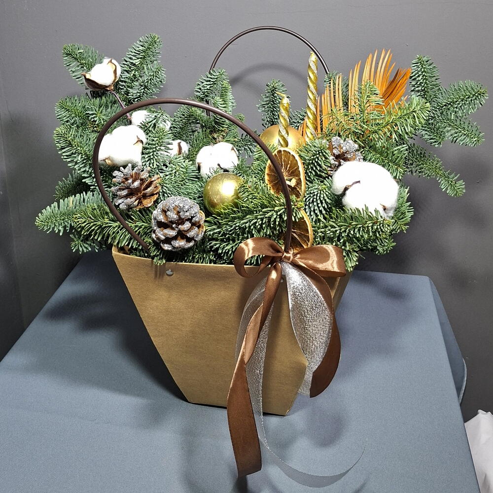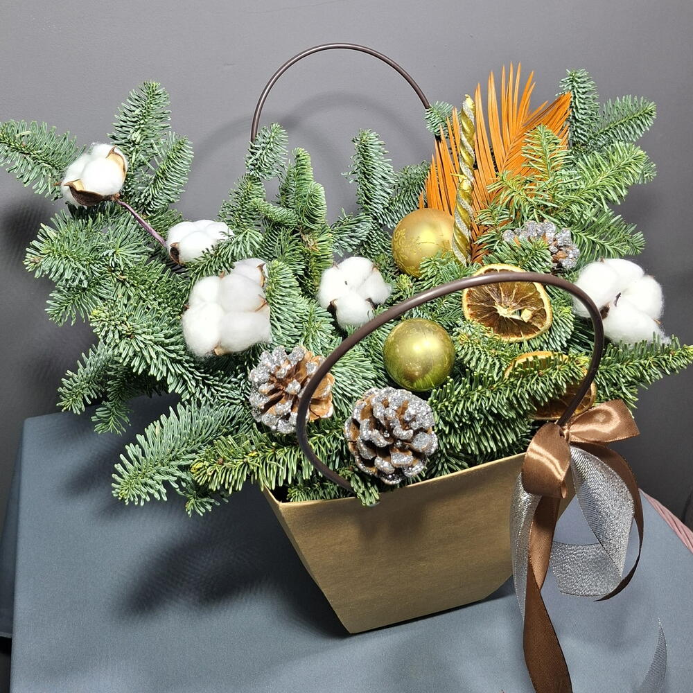 Хлопок - 6 шт. Свеча - 2 шт. Шишка - 3 шт. Нобилис - 2 шт. Оазис флористический - 1 шт. Сумка крафт - 1 шт. бант атласный - 1 шт. апельсиновые дольки - 2 шт. шар игрушка - 2 шт.