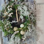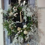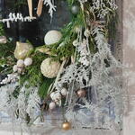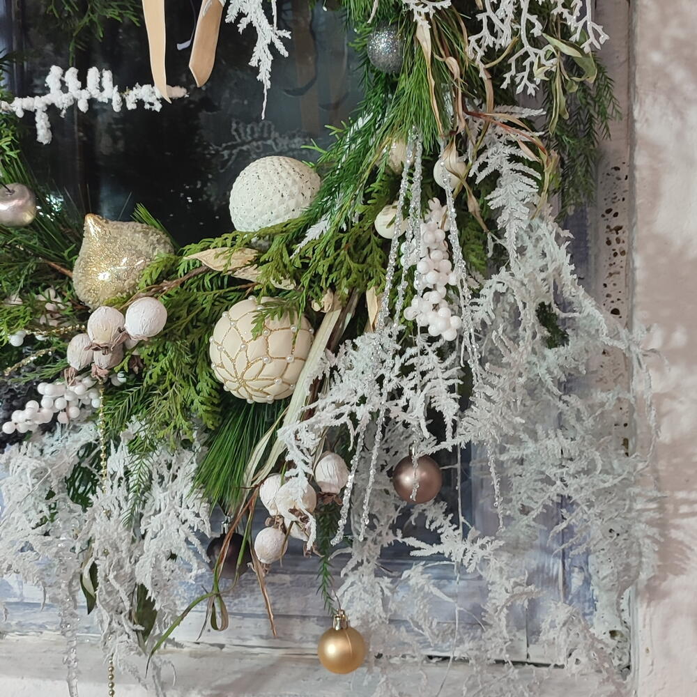 Ягоды декоративные - 7 шт. Шары новогодние - 21 шт. Хвоя живая - 21 шт. бусы новогодние - 2 шт. аспарагус стабилизированный - 3 шт. колокольчики - 6 шт. сосульки декор - 2 шт. ленты бархатные - 2 шт. декоративные ветки шиповника - 2 шт.