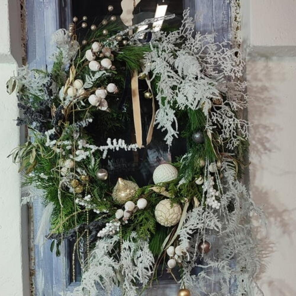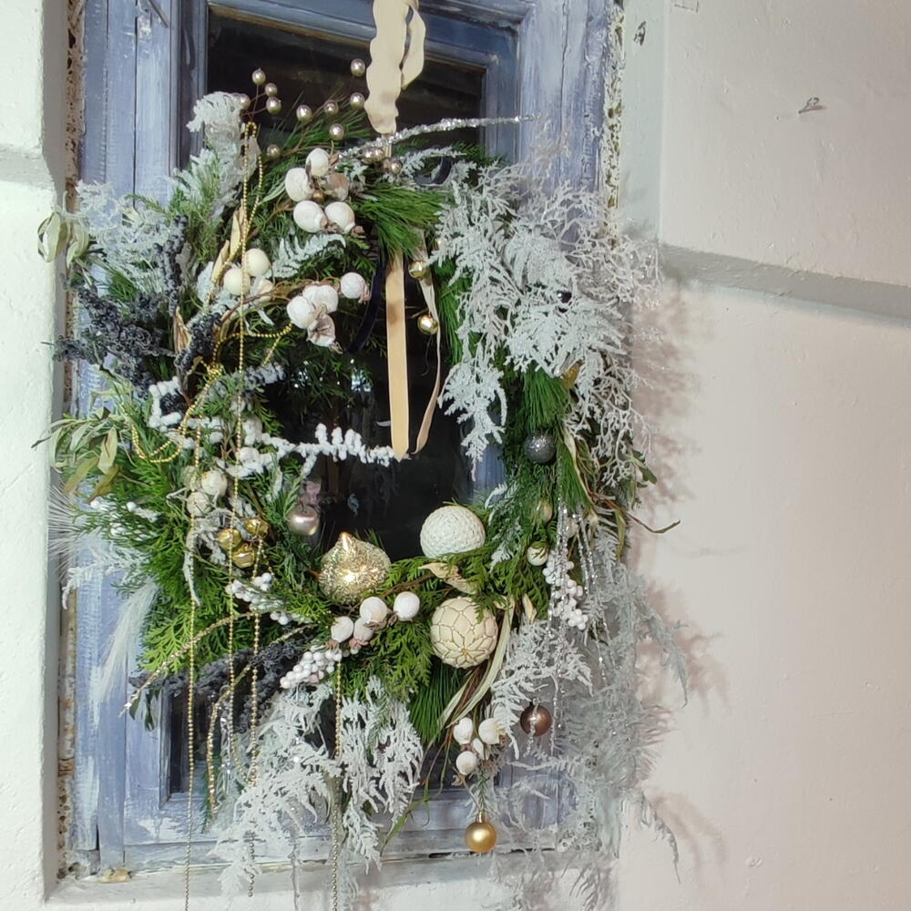 Стильный оригинальный венок из натуральных материалов и живой хвои, с добавлением заснеженного аспарагуса, декоративных веточек и ягод, шаров новогодних премиум класса, бархатных лент.. Единственный в экземпляре, без повторов, авторская работа дизайнера. Отлично подойдёт в качестве незабываемого подарка к новому году и рождеству.