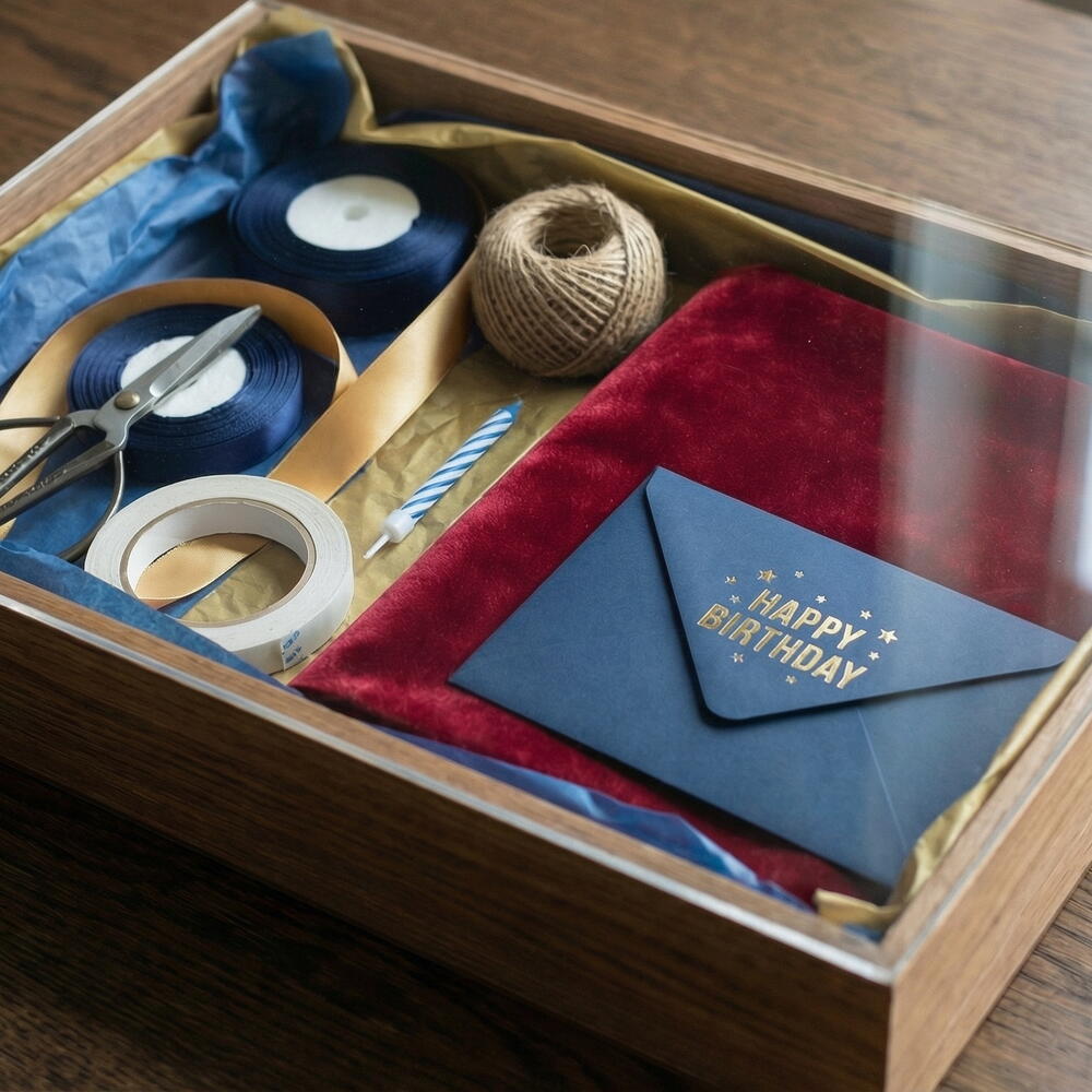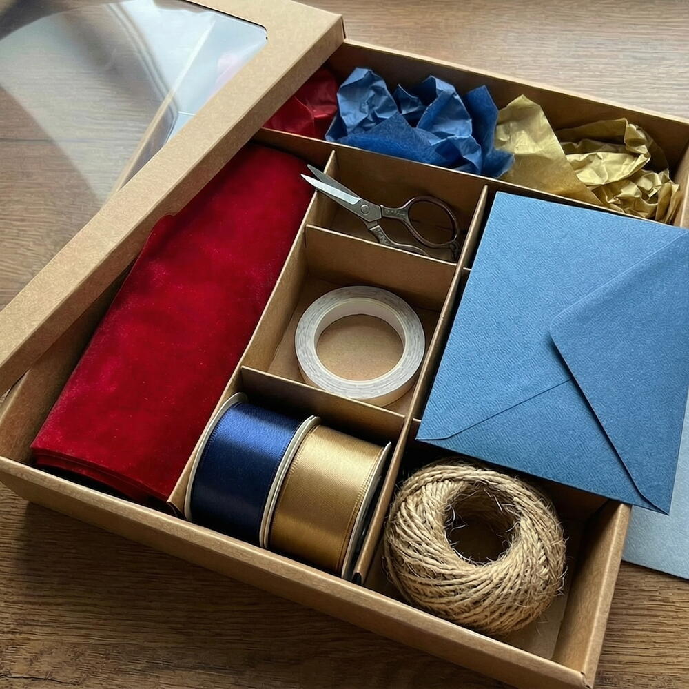 В коробке вас ждёт всё для праздничной упаковки: Для оформления: Бархатная бумага двух видов, дизайнерская бумага. Для бантов и акцентов: Атласные ленты на ваш выбор, жгутовая верёвка. Инструменты: Ножницы, двусторонний скотч, ручка. Персональные штрихи: Именная поздравительная открытка (или место для мини-фотографии), праздничная свеча, набор тематического декора (звёздочки, конфетти, помпоны). Для итога: Конверт для денежного подарка или тёплого письма. Это решение «всё в одной коробке». Не нужно искать, чем завязать бант или куда вложить открытку — просто откройте набор и создайте подарок, который запомнится надолго. Подарите себе время на праздник, а своему презенту — безупречный вид с первого взгляда.
