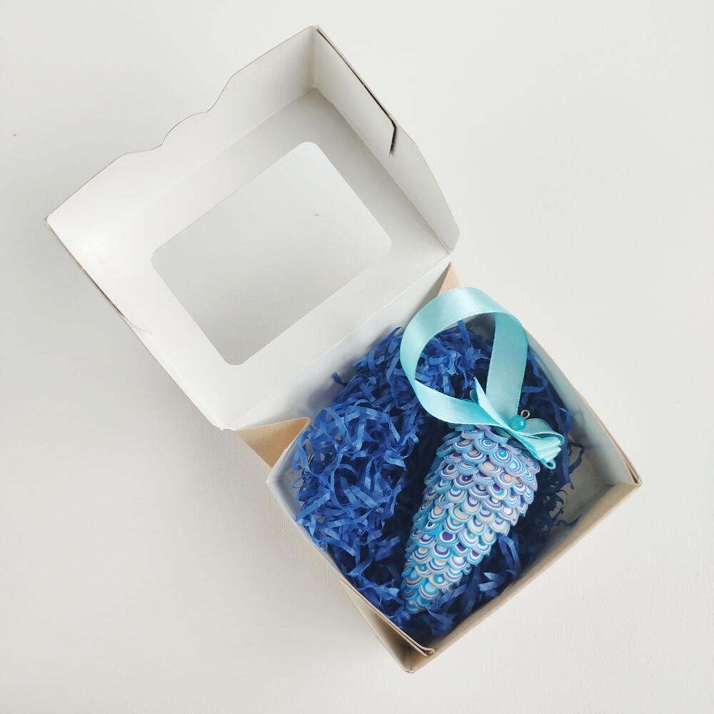 Шишка синяя- лёгкое и не бъющееся ëлочное украшение из полимерной глины. Авторская ручная работа. Высота шишки без ленты 7 см. В подарочной крафтовой упаковке. Есть шишки других цветов и размеров. За опт- скидка.