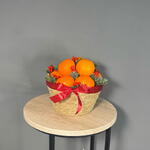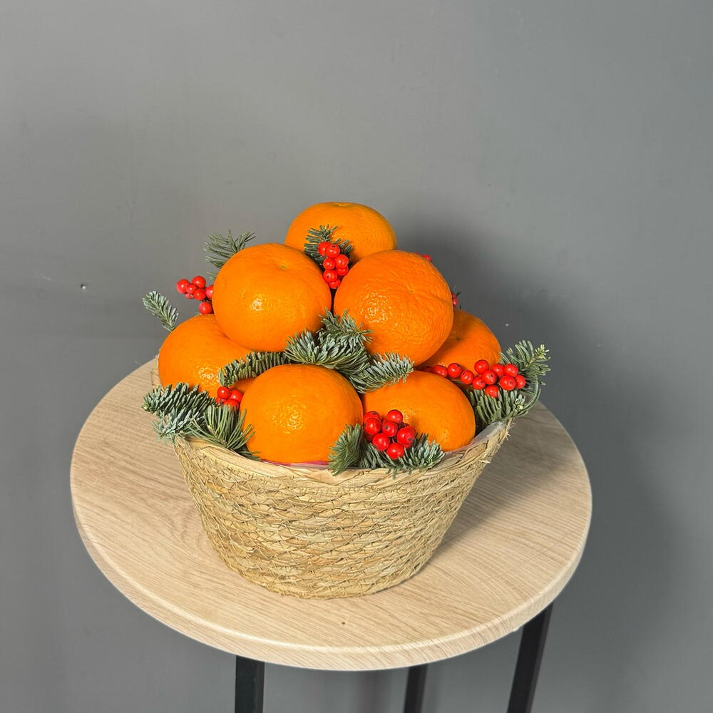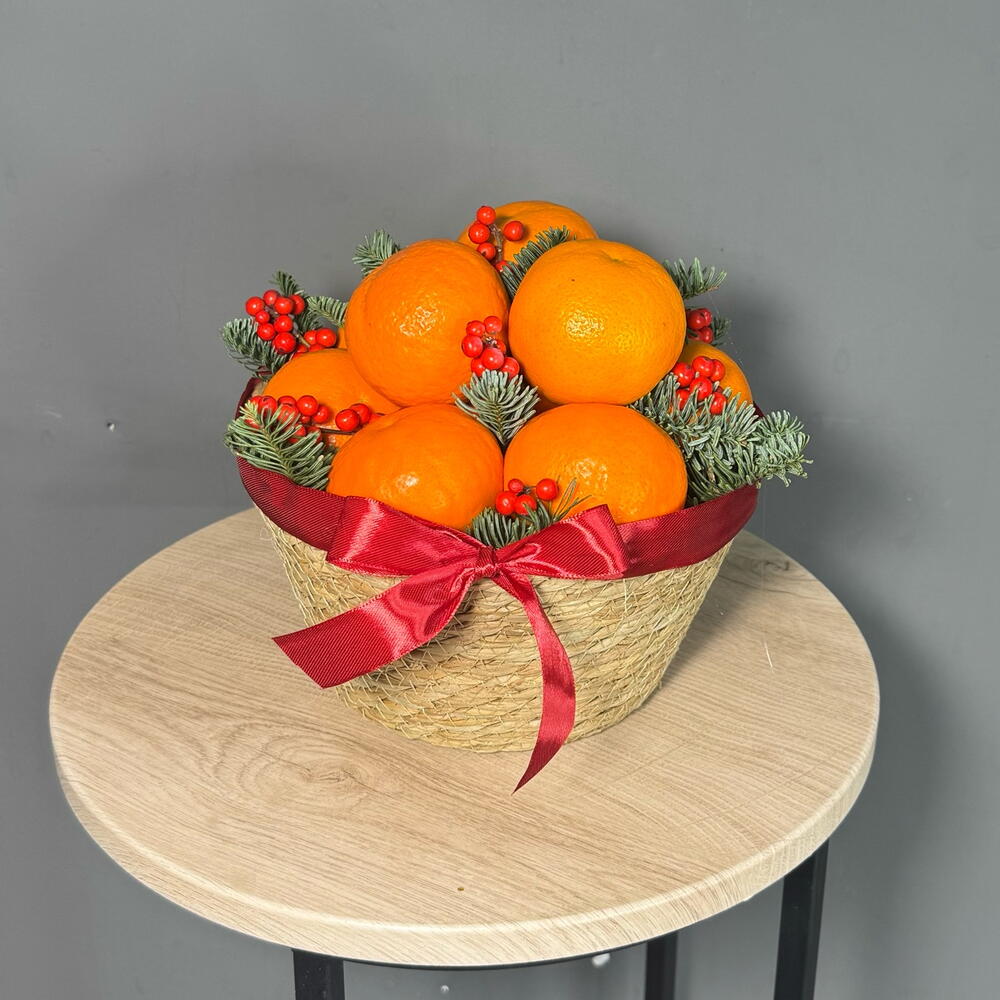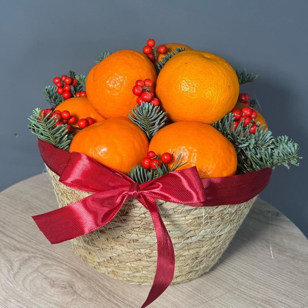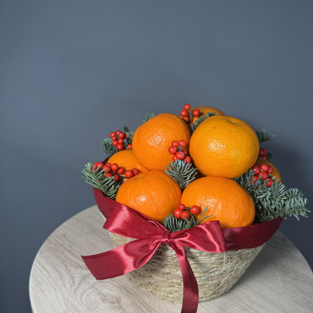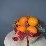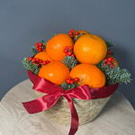Лента атласная - 1 шт. Илекс Красный - 1 шт. Нобилис - 1 шт. мандарины - 1700 гр. корзина джутовая - 1 шт. наполнитель бумага - 1 шт.