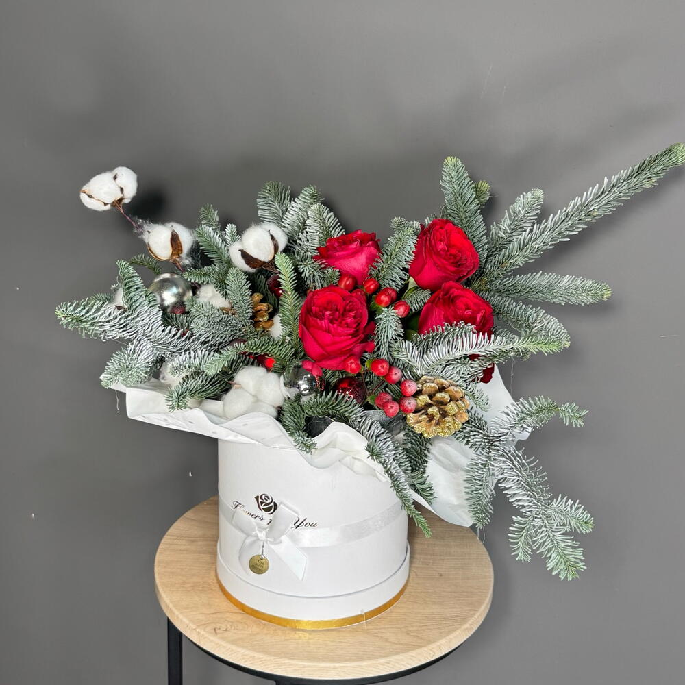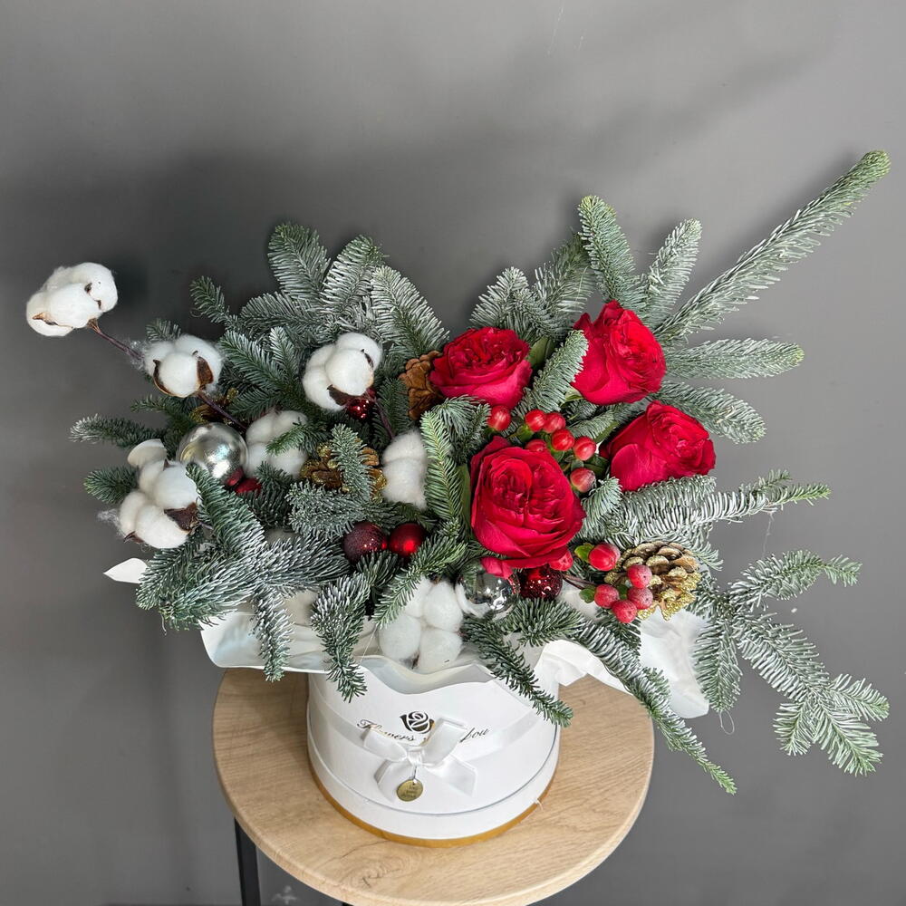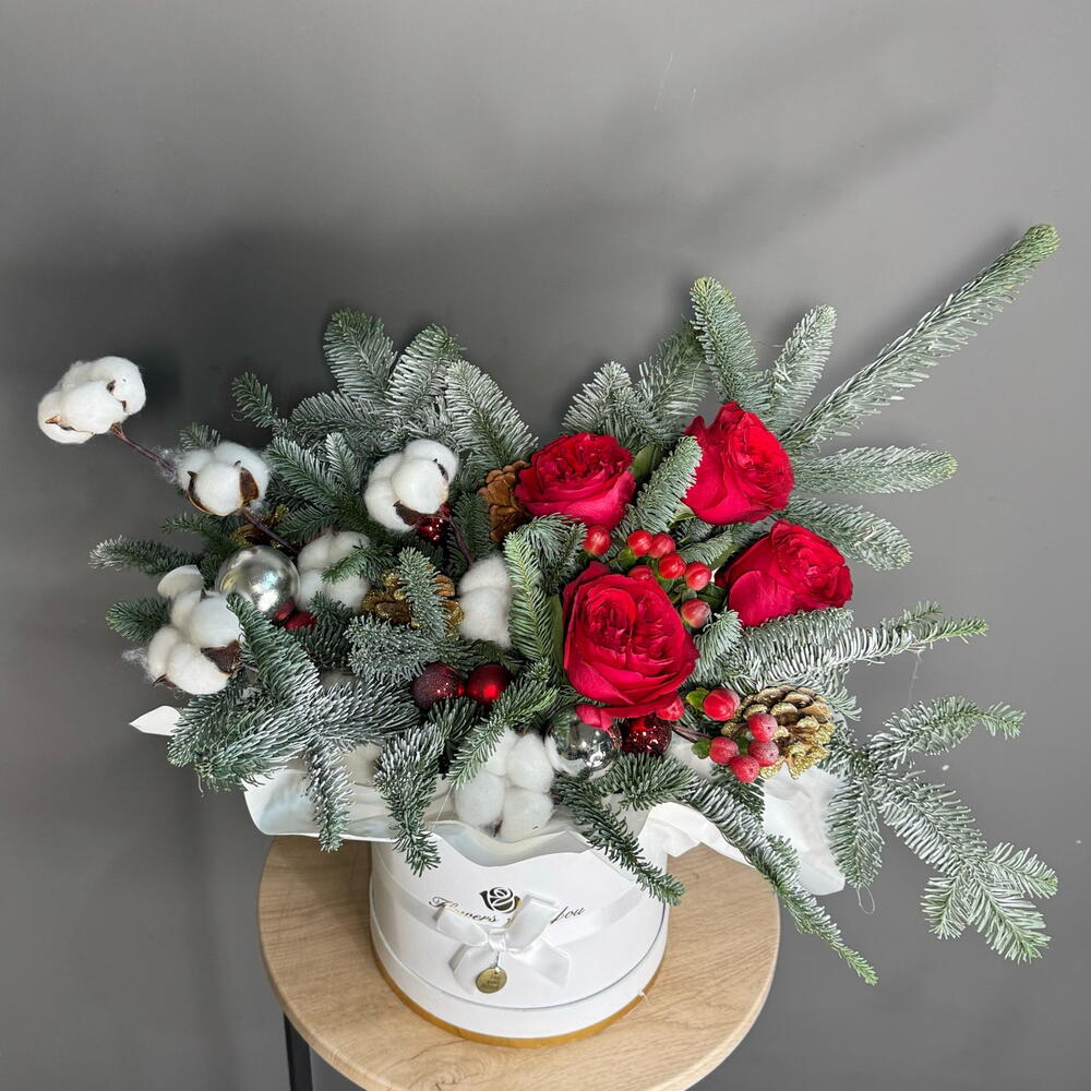 Зимняя композиция с пионовидным пионовидными розами, хлопком, живой хвоей и ягодками